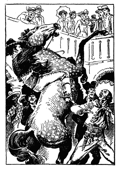 Залишивши бар, майор більше не втручався у приготування до поєдинку. Йому, командирові форту, не годилося сприяти дуелі й навіть наглядати, щоб було дотримано правил. Та молодші офіцери охоче перебрали цю справу на себе й одразу ж заходились визначати умови. Це не забрало багато часу. Про все головне вже домовились, лишалося тільки доручити комусь із присутніх ударити в дзвін, який мав стати сигналом до початку двобою. Це також не становило труднощів, бо, зрештою, було однаково, хто дзвонитиме. Навіть дитина могла дати сигнал до тієї кривавої сутички. Коли б якийсь чужинець випадково опинився в ту хвилину на так званій «площі» перед готелем «Напоготові», він навряд чи й збагнув би одразу, що там діється. Ніч стояла досить темна, проте можна було розгледіти юрбу людей коло готелю, переважно військових, бо до офіцерів, що вийшли з бару, приєднались інші, а також і вільні від варти солдати: довідавшись, що на площі сталася якась пригода, вони поспішили з форту туди. Прибігли й сяк-так одягнені жінки — дружини солдатів, пралі, «сеньйорити» сумнівної репутації — і розпитували тих, що випередили їх, чого зчинилася вся та буча. Всі розмовляли пошепки. Було відомо, що на площі присутні командир форту та інші офіцери, і це стримувало тих, хто, може, й хотів би погаласувати. Юрба, що отак самопливом зібралася на площі, стояла не перед самим готелем, а на відкритій місцині, ярдів за десять від будинку. Проте всі очі дивилися туди з такою напруженою увагою, з якою дивляться лише на захопливе, надзвичайне видовище. Усі стежили за двома чоловіками, що стояли біля протилежних кінців масивної дерев'яної будівлі, де містився готельний бар, що, як уже сказано, мав двоє дверей. Хоч тих двох розділяли важкі, збиті з колод стіни і вони не бачили один одного, проте рухи їхні були однакові, неначе обидва діяли за спільною нечутною командою. Кожен стояв біля вхідних дверей бару, з яких лилося яскраве світло, падаючи широкими скісними смугами на грубу рінь біля будинку, — але не проти дверей, а ледь збоку, осторонь від світла. Обидва трохи нахилилися вперед — наче бігуни перед змаганням, готові в першу-ліпшу мить зірватися з місця. Обидва невідривно дивились у двері, всередину бару, звідки чулося лише цокання годинника. Весь їхній вигляд виразно промовляв: вони чекають тільки умовного сигналу, щоб ускочити туди. Про те, що їхні наміри дуже серйозні, неважко було здогадатися й ще з деяких ознак. Обидва стояли в сорочках, без капелюхів і не мали на собі нічого такого, що могло б якось зв'язати їхні рухи, а на обличчях у них була написана непохитна рішучість; така ж рішучість проглядала і в їхніх позах. Та щоб зрозуміти їхні наміри, не треба було довго міркувати. Навіть чужинець, випадково опинившись на площі, враз збагнув би, що тут ідеться про життя і смерть. Міцно затиснуті в руках супротивників зведені револьвери, напружені пози, сторожке мовчання юрби глядачів і зосереджена увага, з якою всі дивилися на двох чоловіків перед дверима, краще від будь-яких слів говорили про страшну небезпеку, яка була в тому, що робили ці двоє, а коротше кажучи — про те, що їхній поєдинок міг закінчитися тільки смертю! Так тривало аж до вирішальної хвилини. Супротивники стояли, не спускаючи з ока дверей, у які кожен з них мав зайти, — можливо, то були двері в небуття. Обидва чекали сигналу, щоб пе