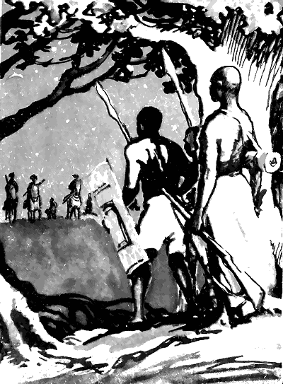 Холмистая саванна грелась в лучах утреннего солнца. В высокой траве сверкали крупные капли росы. На зеленых отлогих склонах полыхали цветы алоэ. Твала, мальчишка-африканец, узкоплечий, с длинными худыми ногами, пересек впадину, заросшую древовидным папоротником, и стал подниматься по склону холма. Одет он был в старую рубаху и бумажные шорты, стянутые ремнем. Плотная шапка курчавых волос вполне заменяла ему шляпу. Темно-коричневое лицо Твалы было озабоченно, короткие широкие брови нахмурены. Он нарушал строжайший запрет: шел на ферму бура[3] Фан Никерка. Там работали батраками его мать и старший брат Фрэнк. Мать и слышать не хотела, чтобы Твала навещал ее, а Фрэнк даже обещал поколотить его, если Твала вздумает заявиться. «Сиди в своей школе и не высовывай носа», — сказал он. И дело было не в том, что мать и брат не хотели видеть Твалу или не любили его. Все объяснялось иначе. Дети батраков с десяти лет должны были работать на плантациях землевладельцев. Таковы правила в Южно-Африканской Республике. А Твале исполнилось уже тринадцать, и он втайне от хозяина все еще учился в школе. Бур не знал о его существовании, а если бы узнал… Твала тщательно хранил свой секрет. Даже товарищи мальчика не знали, что его мать работает на соседней ферме, всего в шести километрах. И мать никогда не приходила к младшему сыну, опасаясь, как бы вести об этих посещениях не дошли до ушей хозяина. Твала тосковал по матери и брату. А тут еще поссорился со своим другом Тембе. Тоска по дому стала невыносимой. К другим по воскресеньям приходили матери и братья, а к нему никто никогда. Ну, разве нельзя незаметно пробраться в хижину матери? Ведь никто не знает его в лицо там, на ферме. Почему люди должны сразу догадаться, кто он? Мало ли народу ходит по степи! Твала медленно поднялся на вершину холма. Зеленая бескрайняя саванна терялась в далекой дымке. На невысоком сером утесе, поднимающемся из травы, сидела стая павианов и молчаливо рассматривала приближавшегося мальчика. Павианы — частые гости на кукурузных полях — прекрасно отличают вооруженного человека от безоружного. Они не боятся ни детей, ни женщин, понимая, что те не могут причинить им вреда. Старый вожак с длинной собачьей мордой не выразил никакого беспокойства и осматривал Твалу скучающим, немного презрительным взглядом. С вершины холма Твала посмотрел на школу, стоявшую в стороне от дороги, и решительно зашагал к ферме по высокой, достигавшей колен траве. Он шел быстро. Разноцветные, словно кусочки радуги, птицы вырывались из-под его ног. И вдруг впереди он увидел группу вооруженных африканцев. Они спускались со склона прямо на Твалу. Он замедлил шаг и нырнул за пахнущие мятой кусты умсузваны. Издали он не мог определить, кто эти люди: полицейские какого-либо вождя или партизанский отряд «Копья народа». Твала спрятался. Когда африканец видит полицию, он предпочитает исчезнуть. Отряд был вооружен копьями. Только у двоих за плечами висели винтовки. Первым шел человек лет сорока с жидкой курчавой бородкой и выпуклым круглым лбом, — видимо, командир. На нем были черный свитер с красной полосой поперек груди, помятые брюки хаки и поношенные ботинки. Все остальные были молодыми парнями. Полицейские-африканцы не имеют винтовок. Европейцы не доверяют им огнестрельного оружия. Твала был почти уверен теперь, что эт