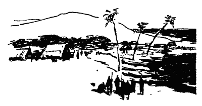 Двічі й тричі на день приходили тубільці по джерела по воду, і ми щоразу «розмовляли», здебільшого за допомогою міміки та пальців. А набравши в свої «бутлі» води, вони мовчки, не сказавши жодного слова на прощання, не зробивши ніякого жеста, повертались додому. Але ще дивніше було те, що вони й досі не запросили мене її своє селище, та й до мого куреня не заходили. Так минув місяць. Якось моїх нових друзів не було два дні зряду. Вирішивши, що з ними щось трапилось, я наступного дня ще зранку пішов до селища провідати їх. Сонце ще не встигло піднятись, але для людини, яка звикла до помірного клімату Європи, спека навіть тепер здавалася нестерпною. Особливо жарко стало, коли я вийшов з лісу й попростував попід садами та городами, де не було високих дерев. Різниця між температурою в тінистих лісах і на відкритому місці була разючою. Добре, що я додумався зробити собі капелюха з широкого пальмового листя. Без нього, напевне, дістав би сонячний удар. Тубільці, правда, ходять простоволосі, але їхні досить довгі кучері надійно оберігають голову від сонячних променів. І все-таки дивно: як вони, майже голі, витримують таку спеку? Особливо жінки, які з ранку до вечора працюють на городах… Стежка привела мене до самого селища. І тут, як і на побережжі, хатини стояли півколом на невеликому майдані. Такі самі гострі покрівлі, що опускаються майже до землі, такі ж маленькі, високо навішені двері, в які доросла людина може пролізти тільки зігнувшись. Двері закривались матами або рогожами. Біля кожної хатини горів вогонь. Навколо вогнищ сиділи чоловіки, жінки, діти. На жару щось варилось у горщиках. Біля стежки, де я зупинився, чорна свиня з поросятами їла лушпиння. Два собаки, низьконогі й каплавухі, обнюхували свинячу їжу. Якась жінка висипала їм з горщика рештки сніданку. Собаки перші почули чужого й тривожно загарчали. Жінка, що стояла до мене спиною, обернулась. Побачивши мене, вона з переляку впустила горщик на землю і несамовито заверещала. Ще якусь мить дивилась на мене, широко розплющивши очі, потім отямилась і щодуху побігла до лісу, не перестаючи верещати. Всі тубільці — чоловіки, жінки, діти — посхоплювались і, помітивши мене, з нестямним галасом порозбігались хто куди. На майдані не лишилося живої душі… Так само зустріли нас і в той день, коли ми з капітаном та поваром Греєм забрели з селище на побережжі. Спочатку всі порозбігались, а потім оточили нас і посадили в окрему хатину. Згадавши це, я повернувся й поспішив стежкою назад… Наступного ранку Лахо з двома іншими тубільцями принесли мені їжу й посідали неподалік. Довго мовчали, зрештою Лахо заговорив. З жестів та міміки я зрозумів, що коли ще раз прийду до них (він показав рукою в бік селища), то мене вб'ють (він направив спис собі в груди). Я дивився йому в очі й посміхався. Але моя безтурботність не сподобалась Лахо, і він знову почав пояснювати, що коли я вдруге піду в селище, мене вб'ють. Цього разу він направив спис уже не на себе, а на мене і кілька разів повторив цей красномовний рух. Я зрозумів: тубільці не хочуть бачити мене в своєму селищі. Але навіщо ж тоді годують? Невже тільки для того, щоб не блукав сам по садах і не лякав жінок та дітвору?.. Хіба я така потвора? Страх тубільців остаточно переконав мене, що білу людину вони бачать уперше. Якось увечері, після заходу сонця, коли на обрії з'явилось р