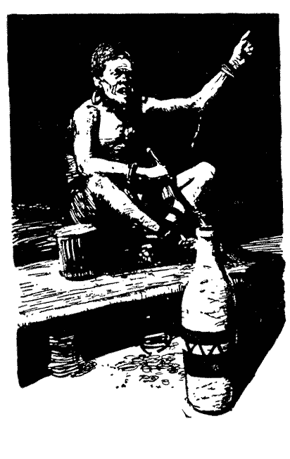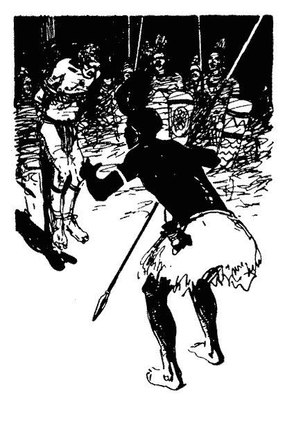 На майдані біля хатин зібралося чимало тубільців, озброєних списами й стрілами. Коли ми підійшли, деякі з них кинулися тікати до лісу, белькочучи щось своєю незрозумілою мовою, інші поховалися за хатинами і звідти несміливо стежили за нами. Але вождь гукнув до них, і всі повернулись назад. Як і в першому селі, тут не було ні жінок, ні дітей. Ми зупинились посеред майдану. Вождь кудись зник. Сміливіші тубільці підійшли ближче й розглядали нас. Я помітив, що в тих, хто не був намазаний сажею, обличчя не здавалися страшними й потворними. Шкіра в остров'ян була темно-шоколадного кольору, волосся чорне, очі теж, носи рівні, а губи товстуваті й напіввідкриті. Перед деякими хатинами горіли невеликі вогнища. Кілька тубільців вмостилося біля найближчого з них, повитягали з торбинок, що висіли в кожного на шиї, сухе листя, підсмажили його на вогні, потім скрутили і закурили. У капітана аж очі заграли. Звертаючись усіма мовами, які він тільки знав, Стерн почав просити й собі тютюну, але його ніхто не розумів. Тоді він витяг свою пінкову люльку і, роблено пихкаючи, попрямував до вогнища. Але тубільці вмить посхоплювались і навели на нього списи. — Неподобство! — пробурчав Стерн, повертаючись назад. — Хоч би раз затягнутися дали! В цей час один з тубільців приніс тліючу головешку і кілька сухих листків, поклав усе це на землю недалеко від капітана, а сам повернувся до гурту. Стерн набив люльку тютюном і смачно затягся. Чорношкірі втупились у нього широко розкритими очима, почулися здивовані вигуки. Задні підіймались навшпиньки, щоб побачити, як димить капітанова люлька. Грей підійшов до Стерна і прошепотів: — Не подобаються мені ці люди, сер. Вони дивляться на нас, мов м'ясники на відгодованих бичків. Скажіть їм, хай відведуть нас до губернатора острова, сер… — Як же їм сказати, коли я не розумію жодного слова з їхньої мови? — знизав плечима капітан. Я розглядав тубільців. Коли мої очі зустрічалися з очима котрогось із них, той щось буркотів і боязко ховався за товаришів.