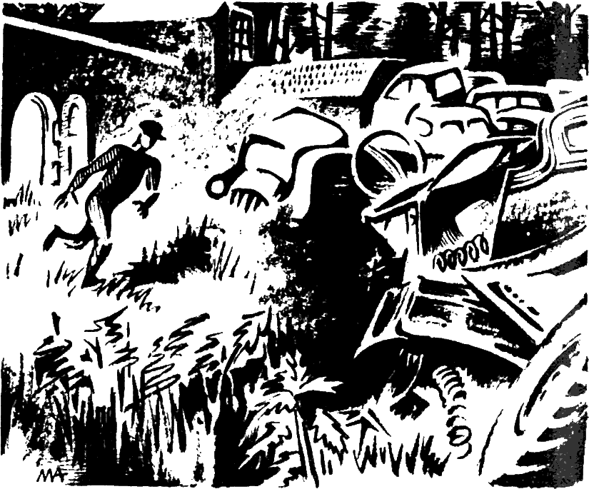 "Я найду его! — повторял он себе. — И тогда буду спокоен". Он добрался до места, где недавно стояла машина, показавшаяся ему сломанной. На шоссе, сколько он мог видеть, не было ни поворотов, ни каких-либо препятствий; оно здесь плавно поворачивало налево. Мишель шел, глядя на землю в надежде, что ему удастся найти ключ к загадке. Вскоре он обнаружил, что от шоссе отходит боковая дорога; через канаву был переброшен сложенный из деревянных брусьев мостик. Внимание Мишеля привлек столб с прибитым к нему листом жести. Луч фонаря высветил четкую надпись, сделанную белой краской: "АО ИПАД". Присмотревшись, мальчик обнаружил под ней более мелкие буквы, под воздействием солнца и непогоды ставшие почти нечитаемыми. Полное название компании ему удалось разобрать с немалым трудом: "Акционерное общество: использование подержанных автомобилей и деталей к ним". "Все ясно! Это та лесопилка, о которой говорил сегодня усатый шофер! Сейчас там свалка старых автомобилей". Осветив фонарем настил моста, Мишель увидел на брусьях следы, оставленные, вне всяких сомнений, колесами тяжелых машин. Кажется, движение на дороге, уходящей в сосняк, было весьма интенсивным. Прошедший ливень не позволял определить, сюда ли свернули два грузовика. Однако у Мишеля на этот счет не было ни малейших сомнений. Внезапное исчезновение двух огромных машин могло иметь только одно объяснение: они одновременно погасили фары и съехали на проселочную дорогу. "В чем же тут дело? — недоумевал Мишель. — Эти два шофера так спешили сделать до утра триста пятьдесят километров. И вдруг согласились свернуть с дороги?.." Вывеска подсказала ему мысль, которая выглядела как будто вполне правдоподобной. "Запчасти… Вот в чем дело! Они, должно быть, свернули сюда, чтобы поискать деталь вместо сломавшейся!.." Нет, абсолютная ерунда! Во-первых, слишком поздний для этого час. Во-вторых, машина, которая выглядела поврежденной, на самом деле оказалась вполне исправной! "Любопытно взглянуть, что это за автомобильная свалка… и что там понадобилось шоферам красного грузовика…" Мишель осторожно зашагал по дороге, прорезанной двумя глубокими колеями, заполненными сейчас дождевой водой. "О, главное-то я забыл!.." Он вернулся к столбу, начертил на указателе с названием компании условный знак и двинулся в сторону свалки. Дорога прихотливо вилась в густом сосняке. Темнота была почти полной. Под ногами шуршала устилавшая землю хвоя. Мишель прошел метров сто пятьдесят, как вдруг впереди мелькнул какой-то свет… Может, ему это чудится?.. Нет, между стволами сосен в самом деле светилась маленькая красноватая точка. И почти сразу же слух его уловил негромкие голоса и какие-то глухие удары. "Похоже, народ здесь не сонный!" — сказал себе Мишель, замедляя шаг. Еще один поворот — и он замер на месте, широко раскрыв от удивления глаза. Дорога вышла на просторную поляну, где во множестве громоздились какие-то огромные, причудливых форм предметы. В этот момент луна вынырнула из-за туч и залила поляну призрачным светом. Теперь Мишель без труда узнал разбросанные по ней предметы: это были остовы самых разных автомобилей — от малолитражек до мощных камионов. Большинство грузовых машин были с тентами и напоминали армейские грузовики. Мальчик поискал взглядом красный грузовик, но не увидел его. На заднем плане темнели крыши каких-