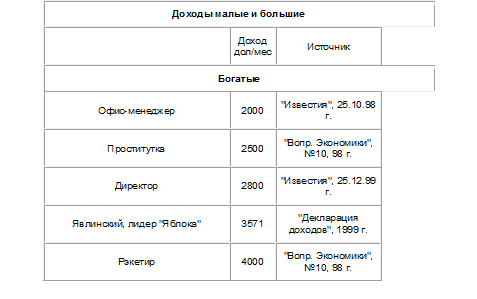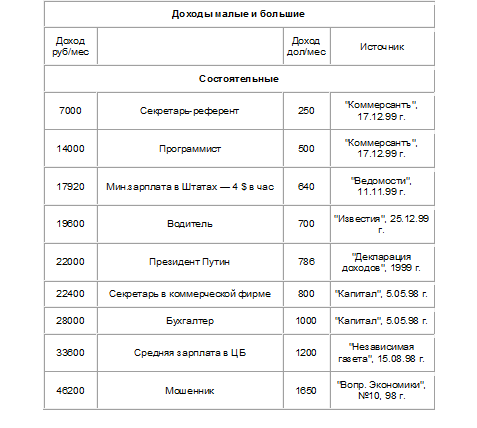 Журнал «Форбс» включил в список богатейших людей мира пять деятелей из России. Их богатство, отмечается в /25/, это, конечно, не накопленные за 8 лет реформ сбережения от заработной платы, показанной в первой колонке таблицы. До 1992 года у завлаба Березовского стартовый капитал равнялся нулю, через восемь лет он владелец 1 100 000 000 $. Четверо других его соратников-олигархов «заработали» даже несколько больше. Для сравнения в /25/ приведены данные по заработной плате в государственном и частном секторах: Единая тарифная сетка в долларах США: Уборщица – 4,6; 6,3. Смотритель – 7,4; 8,0. Лаборант – 8,4; 9,3: 10,5. Ст. лаборант – 11,8. Инженер – 13,5. Кв. рабочий -15,2. Мнс – 17,1. Средняя пенсия – 18,5. Научный сотрудник – 21,9. Прожиточный мин. – 23,0. Снс-кандидат наук – 27,8; 30,9. Профессор – 34,3. Ректор – 38,1. Средняя зарплата в РФ – 42. Доходы в частном секторе в долларах США: Уборщица – 100. Секретарь – 300. Программист – 500. Водитель – 600. Менеджер – 800. Средняя з.п. в ЦБ – 1200. Глав. Бухгалтер – 2000. Руководитель 3000. Россия теперь принадлежит к числу беднейших стран, включающих большинство населения Земли, но она имеет свою специфику /25/: «Россия отличается от них тем, что в число бедноты здесь попали профессура, академическая наука, высокие профессионалы продвинутого производства. По воле «мирового хозяина» этим отраслям и их служителям нет места в новом миропорядке. Они Западом не востребованы. Коммерчески убыточны. Должны естественно отмереть. Нам предстоит ждать да ждать, когда наша профессура, наши профессионалы постепенно вымрут, а вновь нарождающиеся таланты проторят надежные тропы исхода на Запад. Такова воля. Воля мирового хозяина». Черная приватизация и разграбление ресурсов страны заложили под Россию страшную бомбу замедленного действия. Страна вступила в зону техногенных катастроф. Об этом говорится, в частности, в статье В. Сивковой /26/: «Всего несколько лет назад причиной большей части ЧП были природные катаклизмы: землетрясения, наводнения, ураганы. Сегодня, по официальной статистике МЧС, причина двух третей катастроф – несвоевременный и некачественный ремонт. Трубы лопаются, станки выходят из строя, системы управления отказывают, дома рушатся… У нас в год ремонтируется всего три с половиной процента производственных мощностей. И полпроцента жилого фонда. На железных дорогах степень износа оборудования – 55,3%. В прошлом году произошло 10 крушений. В этом году ожидается столько же. В 1999-м мы пережили 26 авиапроисшествий. 70 человек погибли. Одна из причин – эксплуатация воздушных судов с выработанным ресурсом. Две трети судов и две трети автомобильного парка подлежат списанию. Фактический срок службы наших станков – 33 года (нормальный срок по мировым стандартам – 8-9 лет). Средняя степень износа – почти 70%. 70% – это когда в любую минуту может случиться все что угодно». О возрастающей напряженности в Москве говорится в заметке «Москва на пике катастроф?» /27/: «Только цифры (под землей): протяженность сетей водопроводных – 8,8 тыс. км. газовых – 4896 км, канализационных – 5882 км (15,5% из них находятся в ветхом состоянии и требуют перекладки), в том числе 952 км коллекторов и дождевых стоков. На поверхности: более 5 тыс. промышленных предприятий, 6 нефтебаз и 70 химически опасных объектов, более 400 предприятий имеют источники радиации, 46 – исследовательские ядерные установки. Така