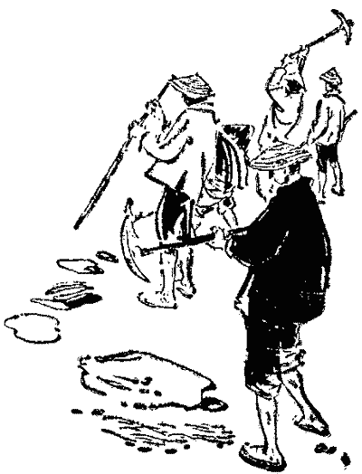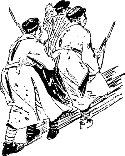 Двері розчинились, і в халупу один за одним увійшли четверо японців з заступами. Один з них обережно поклав на стіл клунок. Побачивши Володю і корейця з сокирою, тривожно загомоніли: