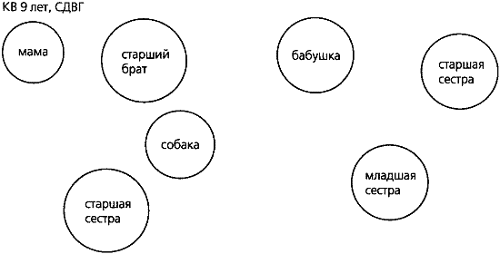 На рисунке видно, что к собаке относятся как к самому младшему члену семьи. Все заботятся об Уле. Это еще один пример того, как отношение друг к другу и к собаке формирует характер каждого из членов семьи и оказывает терапевтический эффект. Таким образом, при одной болезни, но разных устоях семьи насколько по-разному развиваются отношения между ребенком с особенностями развития и животным. В одних случаях мы можем говорить о терапевтическом успехе и положительном результате взаимодействия ребенка и собаки, а в других не только не наблюдается позитивного терапевтического эффекта, но более того, наносится непоправимый вред, когда ребенок либо начинает бояться собак, либо, ощущая свое превосходство над животным, начинает мучить и обижать питомца.2.3. Синдром нарушения (дефицита) внимания с гиперактивностью (СДВГ)