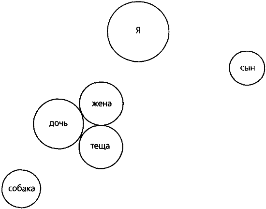 Хозяйка Бонни пришла в ветеринарную клинику с вопросом о состоянии здоровья своего 16-летнего пуделя Бонни. Он был стар, плохо видел, шерстный покров был неровным и тусклым, собака страдала артритом, у нее начинались провалы в памяти — так, например, он не всегда узнавал хозяйку, когда она возвращалась домой из магазина или поликлиники. Хозяйке Бонни было 74 года, год назад у нее от обширного инсульта скончался муж, взрослая дочь и двое внуков жили в США и приезжали не чаще одного раза в два года. Хозяйка уже более 4 лет страдала онкологическим заболеванием, перенесла две операции, но после смерти мужа болезнь начала сильно прогрессировать. На момент обращения к нам она проходила курс химиотерапии, побочными действиями которой были тошнота, головокружение, слабость и депрессия. Она сказала, что если бы не собака, она бы прекратила курс лечения, так как не видит смысла продолжать жить. Но Бонни, если ее не станет, окажется никому не нужным. Поэтому, пока Бонни жив, она будет бороться за свою жизнь. И она боролась. Были моменты, когда у нее просто не было сил выходить на прогулки с Бонни, но она собиралась и осторожно, мелкими шажками, чтобы не потерять равновесие от сильного головокружения и не упасть от слабости, выводила Бонни на улицу. Интересно, что Бонни каким-то образом ощущал состояние хозяйки и в такие дни очень быстро оправлялся и сам просился домой. Так прошел почти год. Хозяйка Бонни уже не могла приехать в ветеринарную клинику и вызвала врача на дом, когда Бонни утром не встал, чтобы поприветствовать ее и категорически отказался от еды. Они представляли собой трогательную пару — два больных старика, которые очень сильно привязаны друг к другу. Врач сразу определил, что Бонни умирает, речь идет даже не о неделях, а о днях. Доктор замялся, не зная, как сказать об этом хозяйке, но она все поняла. С трудом опустилась рядом с Бонни на колени, положила почти прозрачную руку ему на голову. Бонни слабо вильнул хвостом, потом чуть сильнее, а потом приложил все оставшиеся в его маленьком теле силы, поднялся и прильнул к ее коленям. Они так и сидели, молча, прижавшись друг к другу, когда уходил врач. Прощались. Бонни умер на следующий день. Его хозяйка прожила без него одиннадцать дней. В этой истории собака стала единственным связующим звеном между хозяйкой и окружающим миром. Пес спасал хозяйку от ощущения бессмысленности дальнейшего существования. Понимание ответственности за свою жизнь, которая не может прерваться, пока жива старая, больная, никому кроме нее не нужная собака, заставляло женщину бороться с болезнью. Со смертью Бонни хозяйка, словно бы сама себя «отпустила», разрешила себе умереть. Рисунок семьи представлен на рис. 4.4.
