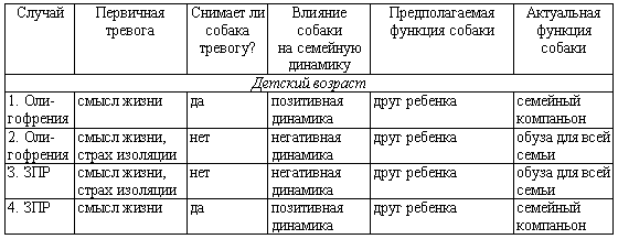 Далеко не в каждом из рассмотренных нами случаев приобретение собаки оправдывало ожидания хозяина и в той или иной степени решало психологические проблемы владельца. От чего зависит, поможет ли собака, облегчит ли она тревоги хозяина? Будет ли взаимодействие с собакой являться анималотерапией для владельцев? Мы составили сводную таблицу рассмотренных случаев, которая отражает, решает ли собака проблему хозяина, как появление собаки влияет на семейную динамику и какова предполагаемая и актуальная функция собаки в семье.Таблица № 1. Показатели снижения первичной тревоги и изменения семейной динамики с приобретением собаки