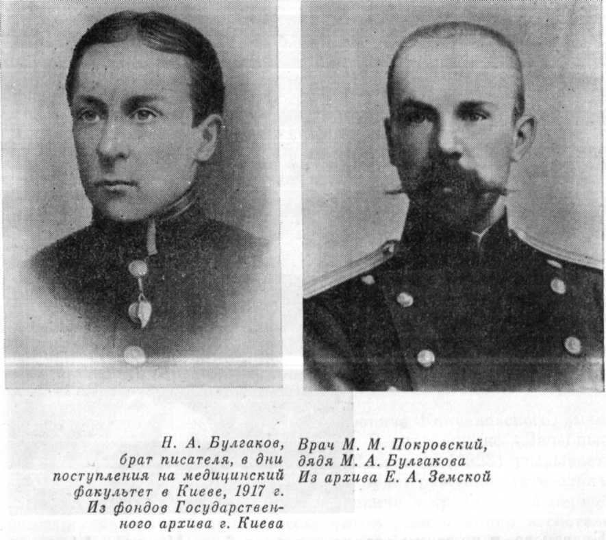 Известно, что врачом стал и Николай Афанасьевич Булгаков (1898–1966), любимый, младший, брат писателя, один из прототипов Николки Турбина. Как явствует из изученных нами архивных материалов, 17 июля 1917 г. он был также принят на медицинский факультет Киевского университета, и этот выбор, очевидно, был сделан не без влияния старшего брата и Ивана Павловича Воскресенского. В связи с призывом на военную службу в Алексеевское инженерное училище Н. Булгаков не смог продолжить учебу на факультете. Однако, как видно из его прошения ректору университета, он ходатайствовал об оставлении его в списке студентов. Сохранилась фотография, представленная Николаем Булгаковым в числе поданных в университет документов. В дальнейшем, окончив Загребский университет, II. А. Булгаков стал видным микробиологом, ближайшим помощником известного французского исследователя д'Эрелля в созданном им институте. В том, что Николаю Булгакову, несмотря на крайнюю нужду в годы учебы, все же удалось стать врачом, причем врачом, настолько блестяще окончившим курс, что вскоре предопределилась его научная карьера, думается, в какой-то мере воплотились и отношение Михаила Афанасьевича к этой профессии, и в частности его глубокий интерес к исследовательской стороне медицины. Николай Афанасьевич Булгаков — один из создателей бактериофагов, организатор бактериологической службы в Мексике. Его нравственные качества отражены и в документах, хранящихся в фонде М. А. Булгакова в Отделе рукописей Государственной библиотеки СССР им. В. И. Ленина. В годы второй мировой войны ученый, являвшийся подданным Югославии, был интернирован и отправлен гитлеровцами в концлагерь вблизи Компьена. Он вел себя мужественно, помогая товарищам по заключению как врач. В 1945 г. бывшие узники лагеря прислали доктору И.А. Булгакову благодарственный адрес и памятный знак ветерана Сопротивления.В. М. Покровская-Булгакова и И. П. Воскресенский «Ивана Павловича целую крепко», — писал М. Булгаков в 1921 г.