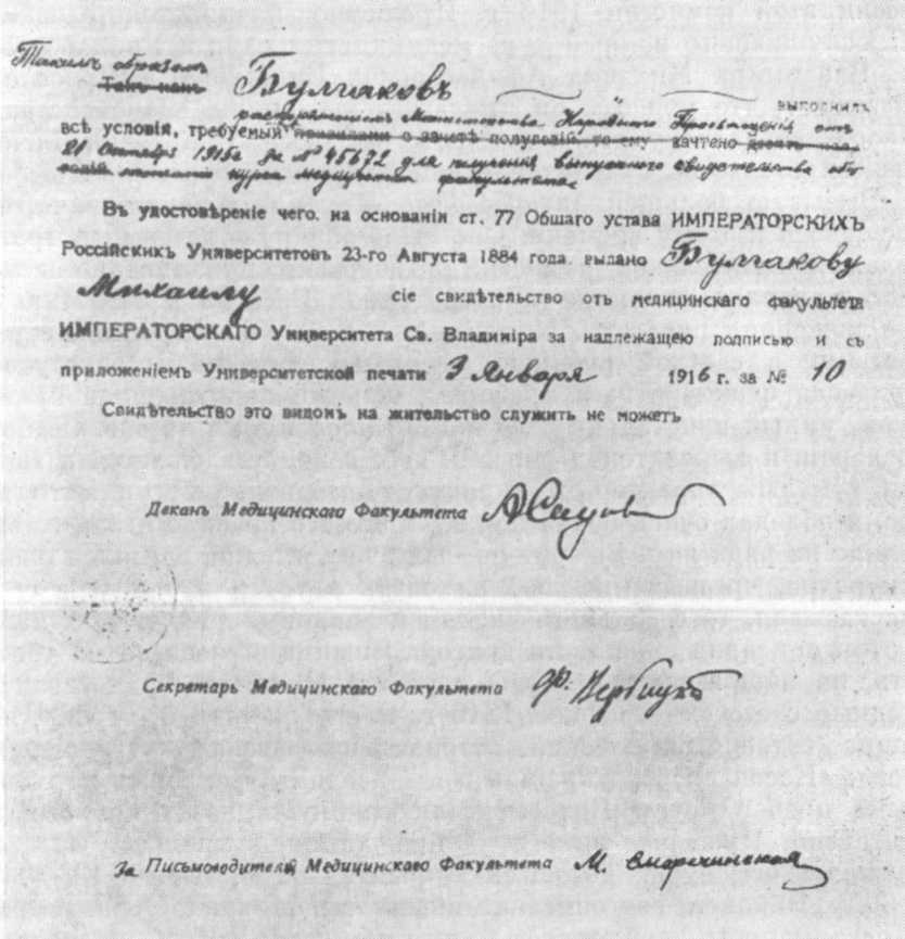 1916 год. Он входит в историю самодержавной России полосой военных тревог. На тысячекилометровом фронте, от верховьев Днестра до Рижского залива, идут кровопролитные сражения. Проиграны кампании в Галиции и Польше, оставлены Брест-Литовск, Ровно, Луцк, Гродно. В месяцы отступления 1915 г. русская армия потеряла около 2 млн человек. «Мои доблестные воины! Сердцем и мыслью я с вами в боях и окопах…» — обращается к многострадальным полкам и дивизиям Николай II. Снова жалкие слова о грядущих испытаниях и трудностях в наступающем году, снова упования на то, что Господь ниспошлет победу. Сообщения в газетах об атаках немецких кораблей и подводных лодок, налетах цеппелинов и гидросамолетов перемежаются с репортажами о посещениях августейшими особами и дамами-патронессами госпиталей и лазаретов с раздачей наград и подарков солдатам, анонсированием третьего выпуска иллюстрированного издания о пребывании Государя Императора в действующей армии, информацией западных агентств о том, что у Вильгельма II рак либо сифилис горла, а также объявлениями о представлениях и феериях — «Разгул Стеньки Разина», «Закон зверя», «Невеста смерти», «Уличная фея». Противник обстреливает перевязочные пункты, топит госпитальные суда (так, 17 марта 1916 г. вблизи турецких берегов погибло судно «Портюгаль», из 26 медицинских сестер удалось спасти 11), применяет новые виды снарядов, начиненных фосфором и другими химическими веществами. Характерны фотографии на первой полосе новогоднего номера газеты «Листок войны» и на обложке «Календаря Красного Креста за 1916 год». Они, по сути, идентичны: посреди бескрайних полей, в снегу, над раненым склонилась сестра милосердия с медицинской сумкой на боку. Нарастающее напряжение передает и тон киевских газет той зимы и весны. «Асептические пакеты для раненых», «Противооспенные прививки», «Помогите слепым труженикам, покупайте их изделия», «Вздувание цен на уголь», «Б ожидании холеры», «Медички и война», «Врачи и сестры 14 передвижного эпидемического отделения сообщают, что все здоровы», «Сифилис: как от него уберечься», «Учреждается резерв врачей с хирургической подготовкой» — вот заголовки некоторых публикаций. Наверное, сразу же после рождественских дней, когда семья Булгаковых, вместе с мамой и Иваном Павловичем, по сути, последний раз все вместе, собралась у елочных огней в родном гнезде, на Андреевском спуске, Михаил Афанасьевич начинает готовиться к экзаменам на звание лекаря. Третьего января 1916 г. он получает зачетное свидетельство об окончании курса медицинского факультета. В нем перечисляются оценки, полученные им на полукурсовых испытаниях и в течение последующих шести семестров: «по физике — пять, по неорганической химии — три, по минералогии — три, по зоологии с сравнительной анатомией — три, по ботанике — три, по анатомии — три, по гистологии с эмбриологией — три, по медицинской химии — три, по органической химии — три, по фармации с фармакогнозией — три, по богословию — пять, по общей патологии — пять, по фармакологии с рецептурой — три, по хирургической патологии и терапии — пять, по частной патологии и терапии — пять, по врачебной диагностике — пять, по патологической анатомии — четыре, по десмургии — пять, по оперативной хирургии с топографической анатомией — пять; по клиникам: нервных болезней — чет
