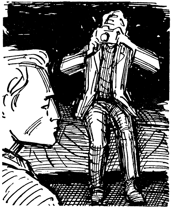 Представление началось с того, на чем оно прервалось накануне. Все персонажи на экране, появляется Прелестная Девушка, а Нищий Философ, самодовольно потирая руки, произносит: — Что за душевная обстановка. Наконец-то мы все в сборе. Прелестная Девушка (не очень твердо держась на ногах): — Послушайте, Философ, я сама знаю, что опоздала, и незачем это подчеркивать, да еще в такой странной форме! Само собой разумеется, что мы здесь собрались всей компанией. А я… ну, меня задержали крайне важные обстоятельства. Деревенский Щеголь (в сторону, с крестьянской хитрецой): «Том Коллинз»[8] и игральный автомат. Инопланетное Чудовище (высунув голову из-за дерева): Тек хростлги вглатер, тек… «А ведь с представлением что-то неладное», — вдруг подумал Лодж. В нем явно был какой-то дефект, неправильность, нечто до ужаса чужое и неприличное, такое, от чего пробирает дрожь, даже если это новое чуждое качество не поддается определению. Неладное творилось с Философом, причем беспокоило вовсе не его присутствие на экране, а что-то совершенно другое, необъяснимое. Странно измененными казались Прелестная Девушка, Приличный Молодой Человек, Красивая Стерва и все, все остальные. Резко переменился Деревенский Щеголь, а уж он-то, Бэйярд Лодж, знал Деревенского Щеголя как облупленного — знал каждую извилину его мозга, знал его мысли, мечты, тайные желания, его грубоватое тщеславие, нахальную манеру посмеиваться над окружающими, жгучее чувство неполноценности, которое побуждало его во имя самоутверждения заниматься восхвалением собственной персоны. Словом, он знал его, как каждый из зрителей должен был знать свой персонаж, воспринимал его как что-то более значимое, чем образ, созданный в воображении: знал его лучше, чем любого другого человека, чем самого близкого друга. Ибо они были связаны теми единственными в своем роде узами, которые связывают творца с его творением. А в этот вечер Деревенский Щеголь заметно отдалился от него, словно бы обрезал невидимые веревочки, с помощью которых им управляли, обрел некую самостоятельность, и в этой самостоятельности уже пробивались первые ростки полной независимости. До Лоджа донеслись слова Философа: — Но я никак не мог обойти молчанием тот факт, что мы здесь собрались в полном составе. Ведь один из нас умер… В зрительном зале — ни шумного вздоха, ни шороха, никто даже не вздрогнул, но чувствовалось, как все напряглись, словно туго натянутые скрипичные струны. — Мы — это совесть, — произнес Усатый Злодей. — Отраженная совесть, принявшая наш облик и играющая наши роли… — Совесть человечества, — сказал Деревенский Щеголь. Лодж невольно привстал. «Я ведь не велел ему произносить эту фразу! Он сделал это по собственному почину, без моего приказа. У меня просто возникла такая мысль, вот и все. Боже милостивый, я же только подумал об этом, только подумал!» Теперь-то он знал причину необычности сегодняшнего представления. Наконец он понял, в чем странность персонажей. Они были не на экране! Они стояли на сцене, на узких подмостках, что тянулись перед экраном! Они уже не спроецированные на экран воображаемые образы, а существа из плоти и крови. Созданные мыслью марионетки, которые внезапно ожили. Он похолодел, похолодел и замер, вдруг со всей ясностью осознав, что одной лишь силой мысли — силой мысли в сочетании с таинственными и 