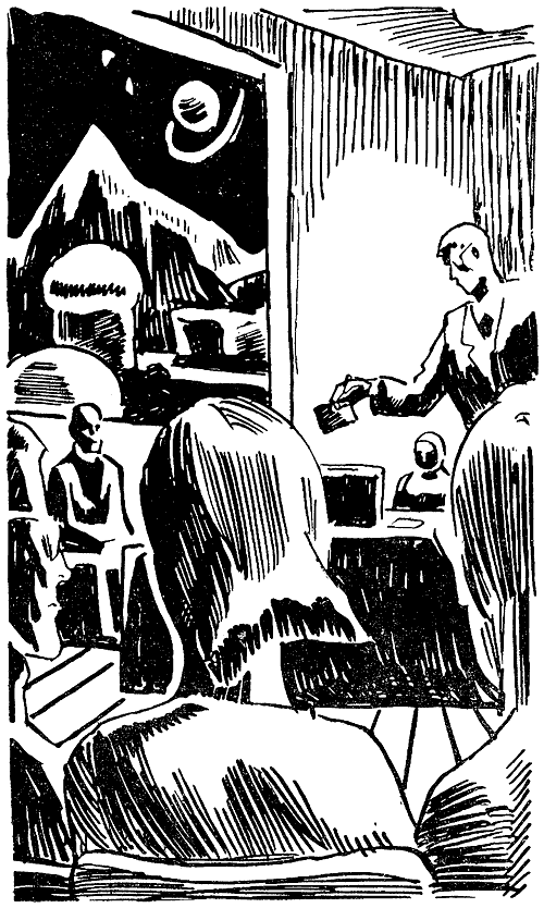 — Старт через четыре дня, — сказал председатель, будто отвечая на взволнованные мысли старого ученого. Председатель быстро нагнулся и сделал какую-то пометку. — К сожалению, мы не научились еще свертывать пространство, — сказал председатель. — Полет вашего питомца будет долгим… — Я знаю. — Но, быть может, наши внуки получат от него победные сигналы, знаменующие великое завоевание нашей цивилизации — установление контактов с разумной жизнью иных миров. — Председатель на миг прикрыл глаза. — Мы, земляне, верим, что рано или поздно встретим во вселенной братьев по разуму Так пусть честь первого знакомства выпадет на долю нашего общего питомца. Оба, не замечая этого, говорили о шаре, словно о живом существе. — А вы не забыли снабдить шар эмблемой? — спросил председатель. — Стрела и колос? — Конечно. Пусть шар понесет нашим братьям по разуму символ Солнечной системы. — Хорошо, я сейчас высвечу эмблему, — сказал ученый. — Чем? — Лазерным лучом. — И, пожалуйста, сделайте ее покрупнее, — сказал председатель. — Совет слушает! — Последнее относилось уже к вызову Сатурна, экран которого нетерпеливо мигал. Ученый уронил лицо в ладони. Он старался мысленным взором пробить неподатливую толщу времени и угадать то, что ожидает посланца Земли там, на далекой Эпсилон Эридана. Шар будет еще где-то на полпути, а он умрет, повинуясь неумолимому бегу времени. Неумолимому… Пока неумолимому. Еще несколько десятков лет — и люди построят наконец кристалл инверсии, с помощью которого можно будет искривлять пространство-время. Какие блага принесет людям кристалл инверсии — сейчас сказать трудно. Об этом можно только гадать. Быть может, корабль, вооруженный кристаллом инверсии, мог бы достичь Эпсилон Эридана за считанные часы? Быть может, с помощью этого аппарата люди взнуздают наконец строптивое время? Быть может… Но к чему пустые мечтания? Через четыре дня серебристый шар стартует к Эпсилон Эридана. Потомкам, возможно, эта звезда будет представляться на расстоянии вытянутой руки, но если летать на обычной фотонной ракете, то она далеко, очень далеко… Хочется верить, что выбор сделан правильно. И шар, наладив первый контакт с Иным Разумом, обессмертит его имя. Давно ушли в прошлое времена, когда человек наивно ожидал встречи с разумными существами чуть не на каждой открываемой планете. Когда-то он ожидал, что встретит их на Марсе… Венере… Но не нашел там ничего, кроме самых примитивных форм жизни. Техника астроплавания совершенствовалась, звезды становились ближе, но предполагаемая встреча с Разумом отодвигалась все дальше в космос. В свое время много надежд связывалось с созвездием Центавра. Но космопланы землян, в конце прошлого века достигшие Центавра, обнаружили там лишь две планеты, поверхность которых была начисто выжжена радиацией. Шли годы, и тоска человечества по родным существам оставалась неутоленной. И когда ученые оповестили мир, что радиотелескопы обнаружили правильные радиосигналы, обладающие периодичностью, сердца забились сильнее. Источник сигналов находился в системе Эпсилон Эридана. Люди на все лады повторяли друг другу подробности: сигналы ритмичны. В них легко уловить определенный порядок. Лингвистические центры работают круглосуточно. Сигналы скоро расшифруют… Всюду — в соляриях, на бегущих лентах улиц — только и раз