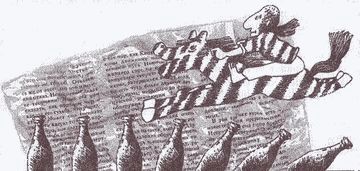 Бутылка была красивая, раскрашенная в бутылочный цвет. Нарисовал ее компотовский сын Феликс Компотов-младший специально к празднику. Стрелочки и надписи на картинке сделал вместо сына отец.