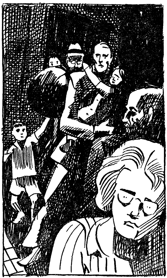 Мальчишки-разносчики уже бегали с газетами вечернего выпуска, когда Ирэн Аппель вышла из здания муниципалитета. Взяв газету, она пробежала глазами по заголовкам и не нашла в них ничего нового. Даже то, что она уже слышала, было еще больше переврано. Теперь уже вещество, находящееся в трубах под городом, называли то змеями, то змееподобным веществом. Она услыхала настойчивый сигнал автомобиля. Ей сигналил, высунувшись из окна автомашины, Майк Моррис, сотрудник редакции новостей. — Эй, что-то происходит в районе, где живут китайцы. Хочешь, поедем посмотрим. Моррис еще не успел закончить фразу, как Ирэн уже захлопнула за собой дверцу машины. Радиоприемник в автомобиле был настроен на радиоволну полицейской радиостанции, динамик, захлебываясь, говорил непрерывно. Во время поворота Майк задел ручку настройки приемника, и Ирэн принялась настраивать его на прежнюю волну. Они повернули на Кларк-стрит, направляясь на юг. Динамик продолжал молча потрескивать. Еще не отдавая себе отчета в том, когда это произошло, они оба заметили, что в темпе движения произошли заметные изменения. Поток машин двигался с юга на север, на углах стояли полицейские, старавшиеся обеспечить непрерывное движение автотранспорта. — Значит, был сигнал тревоги, — сказал Майк. Их остановили на углу Кларк-стрит и 21-й западной. Весь район дальше был закрыт для неслужебных машин, как сказал полицейский. Они объехали четыре квартала, прежде чем им было разрешено снова двинуться в направлении южной части города. Все движение было встречным. На пересечении двух улиц их снова заставили делать объезд. Майк поставил машину на автомобильную стоянку у полицейского участка в середине квартала. — Нам едва ли удастся подъехать ближе, чем сейчас, — сказал он Ирэн. — Хочешь подождать меня здесь? Ирэн решительно распахнула дверцу машины. Они двинулись вместе, стараясь идти, не сталкиваясь с встречной толпой. Люди шли им навстречу, одни рыдали, другие шли как в трансе. Ирэн время от времени поглядывала на небо. По нему неслись тучи, но дождя еще не было, по улице бежали потоки воды. В этих ручьях плыли части одежды, которые закупоривали сточные решетки, создавая водовороты, заставляя воду растекаться, подниматься почти до уровня тротуара. Ирэн, хотя был жаркий день, бросило в дрожь. Ближе противоположной универмагу стороны улицы им подойти не удалось. Путь им преградили автомобили пожарной команды, полиции и «скорой помощи». — Я прорвусь туда, — мрачно сказал Майк Ирэн, — а ты лучше останься здесь. Ирэн понимающе кивнула и вошла в магазин прохладительных напитков. Она вынула свой блокнот. — Что тут произошло? — спросила она владельца магазина. — Господи, — откликнулся тот, — все с ума посходили! Полицейский сказал мне, что перекрыли всю канализационную систему. Нужно держаться в стороне от всякой воды. И драпать, если увидишь, что из нее что-то вылезает. Ирэн вышла из магазина и вошла в другой. Оттуда она прошла еще в один и так далее. От полицейского она узнала столько, сколько не смогла выудить у всех владельцев лавок. — Надо признаться, леди, что мы ничего не знаем. Одни говорят, что это какие-то змеи; другие, что люди превращаются в воду, которая течет по улицам, а некоторые утверждают, что какое-то вещество их растворяет. Ирэн Аппель подошла к жилому дому, который поспешно покидали жильц