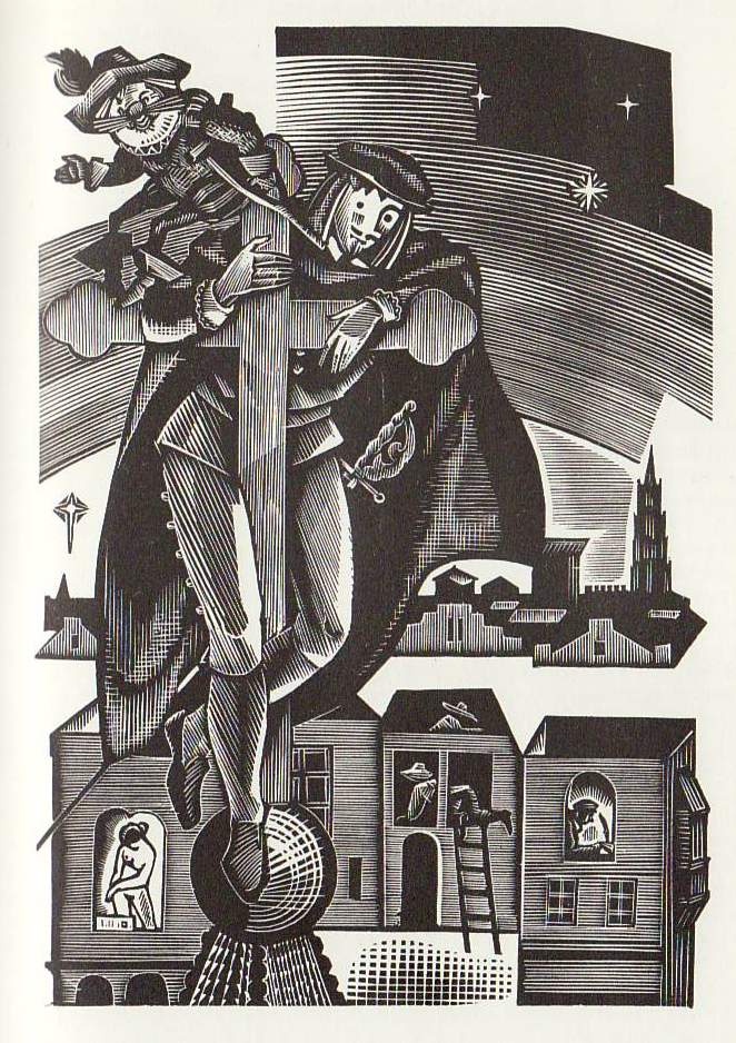 Повесть «Хромой Бес» — единственный прозаический опыт драматурга Луиса Велеса де Гевара — вышла в свет в Мадриде в 1641 году. Согласно предположению одного из первых комментаторов повести — А. Бонильи-и-Сан Мартина, Велес до Гевара сочинял ее урывками, начиная с февраля 1637 года и кончая июлем 1640 года. Достоверно известно, что хвалебный сонет и пародийный «Указ Аполлона», с чтением которых герой повести дон Клеофас выступает перед севильскими «академиками» (девятый и десятый «скачки»), были прочитаны самим Велесом де Гевара во время придворных празднеств 21 февраля 1637 года, из чего, однако, можно сделать разные выводы: либо повесть к этому времени была в целом завершена, либо писатель включил в пее сочиненные им сонет и «Указ» позднее, воспользовавшись ими как подходящим к случаю материалом. Плутовской роман — жанр по своей природе не менее «протсистнчный», нежели его — с легкостью меняющий обличья, хозяев и условия существования — герой, предстает в «Хромом Бесе» в почти до неузнаваемости измененном виде. Как отмечает Л. Пинский, автор обстоятельной вступительной статьи к первому русскому изданию «Хромого Беса» (Луис Велес де Гевара. Хромой Бес. Перевод с испанского Е. Лысенко. М., «Художественная литература», 1964), Велес де Гевара выделяет из биографии героя жанра — пикаро только один студенческий период н замыкает повествование в рамки новеллистического эпизода, рассказывающего о преследовании «вечного студента» дона Клеофаса жаждущей женить его на себе «фальшивой» девицей доньей Томасой. Эта «цикличная» композиция повести — вполне в духе традиций «Ласарильо» и «Гусмана де Альфараче» — классических образцов жанра. Однако если традиционный герой — пикаро за время, отделяющее начало повествования от его конца, успевал пройти целую школу жизни и познать не только окружающую действительность, но и прежде всего самого себя, то дои Клеофас в основном — зритель грандиозного спектакля на кеведовскую тему «мир изнутри». Весь огромный жизненный опыт, приобретаемый пикаро за время странствии по свету, в повести Велеса де Гевара «передоверен» Хромому Бесу. Введение в сюжет «двойника» героя — его спутника и «приятеля» — Хромого, а вместе с тем и появление диалогической формы повествования — основная новация Велеса до Гевара. Образ Хромого Беса писатель заимствовал из фольклора, из народной демонологии, где Хромой Бос фигурировал также под именами Ренфаса и Асмодея. «Хромой бесенок знает больше других», «Хромой бос проворней прочих» (изречение, по смыслу близкое к русскому: «Наш пострел везде поспел») — гласят испанские народные поговорки. В протоколах инквизиционных процессов XVI–XVII веков сохранились записи «ведьмовских» заговоров и заклинаний, в которых не раз встречается имя Хромого Беса. Не столь всесильный, как другие демоны, не столь устрашающего обличья — небольшой рост героя Велеса де Гевара создан был народным воображением, — оп, однако, имел славу самого ловкого, самого скорого посредника в любовных и прочих делах, «греховодника», любителя танцев и развлечений, подбивающего на подобные занятия смертных, — у Белеса де Гевара он «самый озорной из всех адских духов». Этот-то всеведающий хромой циник, бес-пикаро (по определению Л. Пинского), увлекает дона Клеофаса, оставляющего на время студенческую скамью, в воздуш