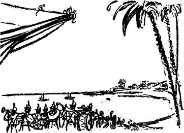 Что еще сказать? Палка бессильно опустилась, а Сен-Берен застонал… Один, два, три раза палка угрожающе поднималась; один, два, три раза она безобидно опускалась, сопровождаемая жалобным вздохом. Тонгане потерял терпение. Он выскочил из засады и мощным ударом положил конец нерешительности своего господина и существованию гель-тапе. Сен-Берен испустил еще один вздох, на этот раз удовлетворенный. Тонгане завладел игуаной. — Завтра, — сказал он, — кушать гель-тапе. Мой его жарить. Будет много вкусно! 16 декабря мы встали на рассвете. Сначала мы обогнули деревню, где заметили мало обитателей в этот утренний час. Старый басурман Доло Саррон проводил нас взглядом, и мне показалось, что он сделал по нашему адресу угрожающий жест. В километре оттуда мы пересекли лес из карите, нтаба и банов, о чем нам поведал доктор Шатонней. — Нтаба, — сказал он, — это фикус огромных размеров. Его листья, шириной от двадцати пяти до тридцати сантиметров, употребляются для крыш. Его плоды, созревающие в июне, состоят из трех-четырех больших бобов, купающихся в сладком соке. Туземцы очень их ценят. Мы, европейцы, предпочитаем плод саба, который напоминает нашу вишню. Бан — это род пальмы, его плод, как видите, походит на сосновую шишку. Его ветви употребляют на крыши для хижин, на большие корзины для переноски грузов, какие есть и в нашем караване. Из его листьев плетут шляпы, скатерти, сумки для провизии. Наконец, из высушенных и расколотых ветвей получаются превосходные факелы. Мы все время освещаемся такими факелами. Незадолго до девяти часов тропинку пересекла речка, где кишели, как обычно, кайманы[31]. А мы должны были перейти ее вброд. Я тогда заметил, что мы впервые попали в такую передрягу. До сих пор мы находили мосты, или вода была едва по щиколотки нашим животным. А на этот раз перед нами была порядочная речка. К счастью, ее уровень оказался ниже, чем мы предполагали. Он был всего по грудь нашим лошадям, и они перешли без затруднений. Но для ослов это было совершенно другое дело. Едва лишь эти животные, впрочем, сильно нагруженные, достигли середины речки, как дружно остановились. Погонщики напрасно старались подогнать их. Они были нечувствительны как к ободряющим крикам, так и к ударам палки. — Ага! Мой знать! — сказал один из погонщиков. — Их хотеть креститься. — Да, да! — загалдели его товарищи. — Их ждать креститься. Каждый из погонщиков, наклонясь, взял в горсть немного воды и вылил на голову животного, к которому был приставлен, произнося при этом непонятные слова. Господин Тассен объяснил: — Этот обычай ведется здесь с незапамятных времен. На первом же броде, который попадается на пути, обычай требует крестить ослов. Вы увидите, что теперь, когда обряд выполнен, они пойдут вперед без всяких затруднений. Однако это было не совсем так. Было около 30° в тени. Ослам, вероятно, понравилась свежесть воды, и они решили, что ванна будет еще приятнее. После двух-трех радостных прыжков они весело повалились в речку и катались по дну с таким удовольствием, что плохо привязанные грузы начали отрываться. Пришлось их вытаскивать. Погонщики занялись этим с характеризующей их мудрой медлительностью, так что если бы не солдаты капитана Марсенея, мы лишились бы половины нашей провизии, подарков, товаров для обмена, что было бы невознаградимой потерей. Когда Барсак выражал нетер