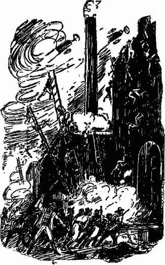 Потрясенные только что пережитой ими ужасной сценой, забыв все, что не имело прямого отношения к их горю, Жанна и Льюис долго стояли обнявшись. Потом понемногу слезы их высохли, и, глубоко вздохнув и отодвинувшись друг от друга, они вспомнили о существовании внешнего мира. Первое, что их поразило, несмотря на недалекий смутный шум, это — ощущение тревожной тишины. В коридоре, ярко освещенном электричеством, гробовое молчание. Дворец казался мертвым. Снаружи, напротив, крики, ружейные выстрелы, смятение увеличивались с минуты на минуту. Они прислушивались к этому необъяснимому шуму, и Жанна вдруг поняла его значение. — Можешь ты идти? — обернулась она к брату. — Попытаюсь. — Идем! Плачевная группа — девушка, поддерживающая мужчину, истощенного четырьмя месяцами мучений, — вышла из каземата. Они прошли по коридору и проникли в вестибюль, где дежурил тюремщик. Вестибюль был пуст: негр исчез. С трудом поднимались они от площадки к площадке. Ключом, похищенным у Вильяма Фернея, Жанна открыла дверь и оказалась вместе с Льюисом в той же комнате, где незадолго перед этим оставила в пьяном сне страшного безумца, еще не зная, что он ее брат. Как и вестибюль, комната была пуста. Ничто не изменилось с тех пор, как она оттуда вышла. Кресло Вильяма Фернея еще было придвинуто к столу, уставленному бутылками и стаканами, и девять стульев стояли полукругом около него. Жанна усадила брата, ноги которого подгибались, и только тогда почувствовала странность положения. Что значит это безлюдье и эта тишина? Куда девался их палач? Повинуясь внезапному побуждению, она осмелилась оставить брата и дерзко отправилась осматривать дворец. Она начала с первого этажа, не пропуская ни одного уголка. Проходя перед наружной дверью, она заметила, что та была заботливо закрыта. Она никого не нашла в первом этаже; но все его внутренние двери, широко распахнутые, доказывали, что обитатели дворца бежали сломя голову. С возрастающим удивлением она прошла остальные три этажа и также нашла их пустыми. Невероятно, но дворец был покинут. Три верхних этажа пройдены, оставались лишь центральная башня и терраса, над которой она возвышалась. У подножия лестницы, ведущей на террасу, Жанна остановилась на мгновение и стала медленно по ней подниматься. Нет, дворец не был покинут, как подумала Жанна. Когда она поднялась по лестнице, до нее снаружи донесся шум голосов. Она прошла последние пролеты и осторожно, защищенная тенью, осмотрела террасу, освещенную лучами заводских прожекторов. Все население дворца собралось тут. С дрожью ужаса Жанна узнала Вильяма Фернея. Она различила также советников, которых видела два часа назад, нескольких людей из Черной стражи и дворцовых прислужников-негров. Наклонившись над парапетом, они что-то показывали друг другу вдали, обмениваясь больше криками, чем словами, и возбужденно жестикулируя. Что так волновало их? Внезапно Вильям Ферней выпрямился, отдал громовым голосом какой-то приказ и, сопровождаемый своими людьми, устремился к лестнице, на верхних ступеньках которой находилась Жанна. Все они яростно размахивали револьверами и ружьями. Еще секунда — и убежище Жанны будет открыто. Что сделают тогда с ней эти люди, охваченные свирепым возбуждением? Она погибла. Испуганно оглядываясь, бессознательно ища немыслимую помощь, Жанна вдруг увидела две
