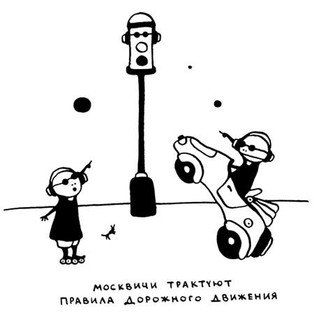 Москвич свободно переходит дорогу в любом месте. Иногда у него есть с собой синий фонарик, которым он светит в глаза автомобилисту, и пока тот рассуждает, что же значит синий сигнал светофора, москвич успевает перейти дорогу и скрыться за горизонтом. Если автомобилисты ловят москвича и пытаются отобрать у него синий фонарь, он неистово верещит: «Это мигалка! Вы ответите по закону, черти!» Москвич всегда трактует правила дорожного движения в свою пользу, где бы он ни был — по ту или по эту сторону ветрового стекла. Поучительна встреча таких москвичей. Растолковывая друг другуправила (один стоит на проезжей части, другой впрыгнул всеми четырьмя колесами на тротуар, но собирается вот-вот спрыгнуть на проезжую часть, где стоит первый), они могут сочинить поэму или даже целый эпос. Пока не приедет бесшумный черный эвакуатор и не эвакуирует их в неизвестном направлении навсегда.