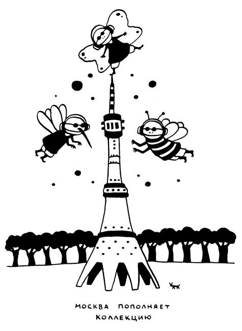 Лучших бабочек Москва пришпиливает на стенку сразу, не дав им поистрепать крылья. У неё много высоток, на каждой высотке — шпиль, каждый шпиль — игла острая. Особо ценные экземпляры Москва нанизывает на Останкинскую иглу — здесь располагается центральная часть её коллекции, её краса и гордость.