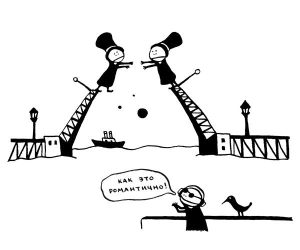 Москвич считает, что разводные мосты — это страсть как романтично. Надо ночью обязательно всех перебудить и бежать смотреть, как большой кусок асфальта поднимается над уровнем остального асфальта, и медленно ползет вверх. А через час за километр от него другой такой же точно кусок асфальта ползет вверх. И еще один потом. С точки зрения питерца, разводные мосты — это не романтика, а крушение всех надежд. Бежишь-бежишь к любимому человеку — а на пути большой кусок асфальта вырастает. Или сидишь-сидишь у любимого человека, а он говорит: «Ну, пора тебе домой, а то скоро мосты разведут!» Ужасно бодрит!
