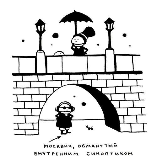 Вечером, прячась под мостом от ливня и порывистого ветра, легкомысленный москвич оплакивает свою горькую участь, а его внутренний синоптик уходит в глухую несознанку, оставив вместо себя автоответчик, который в любое время дня и ночи откликается на запрос хозяина бодрым перестуком капель по жестяной крыше. И, что самое обидное, ни разу не ошибается.