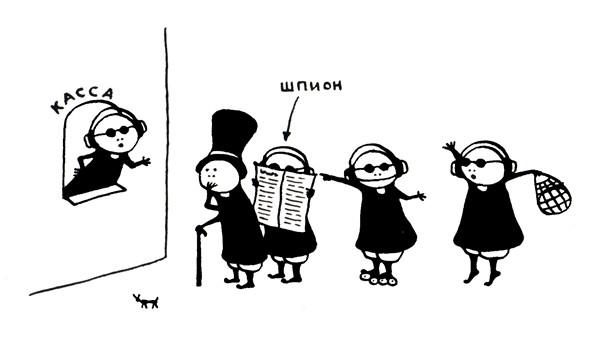 Питерец, когда приезжает в Москву, тоже не сразу врубается, что к чему. Он подходит к кассе протягивает деньги и тихо так, чтобы не услышал стоящий за его спиною шпион, говорит: «Дайте, пожалуйста, проездную карточку.» «Чего? Кого? Быстрее говорите! Не задерживайте очередь!» — кричит касса. Пока питерец собирается с мыслями и пытается говорить быстрее, очередь понимает, что из-за этого отморозка она уже везде опоздала и лупит его башмаками и авоськами, а стоящий за спиной шпион достаёт из кармана секретное шпионское оружие и добивает несчастного.