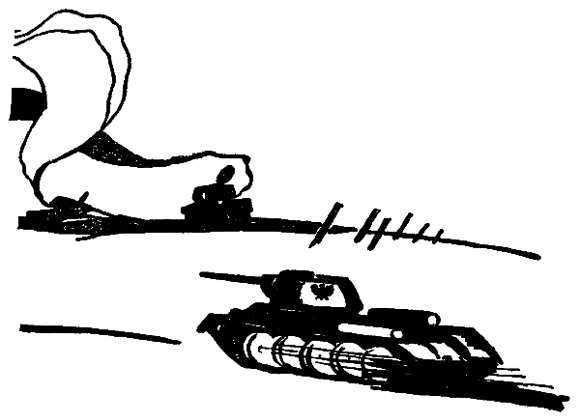 «Во время атаки танк поручника Козинеца шел чуть сзади. Вдруг нас оглушило. Это рикошетом отскакивали снаряды — один, другой, третий, четвертый. Осколком ранило командира орудия Мариана Гоша. В ушах у меня стоял шум и звон. Я ничего не слышал, но мы продолжали двигаться. Значит, целы. Мы шли параллельно дороге. На поле — хлеб в копнах, впереди — пепелище да закопченные кирпичные трубы. Немцы выскакивали из окопов и укрытий и бежали. Я бил по ним из пулемета. Въехали в деревню. На пути — грузовик, подмяли его под гусеницы. Я слышал, как о броню стучали пули. Огонь вели из пулеметного гнезда. Немцы хотели отсечь от нас пехоту. Выстрел из орудия — и ничего не слышно. Это Козинец утихомирил немцев. Станковые пулеметы находились в глубине деревни, в саду. Наконец немцы отступили, оставив несколько обгоревших танков и орудия. На перекрестке стоял разбитый Т-34».