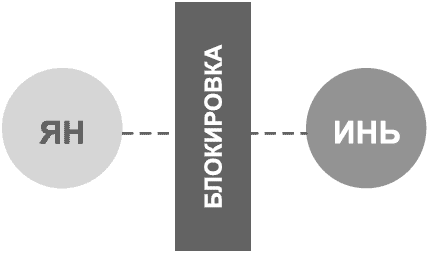 Можно утверждать, что в этом мире за любой формой неблагополучия, неустроенности и несовершенства всегда скрывается та или иная разновидность двойственности. Не является исключением и любая форма патологии — как соматическая, так и психологическая. Здесь я буду говорить только о последней. Согласно моему глубокому убеждению, все личностные проблемы, все виды личностной патологии, в конечном итоге, сводятся к той или иной разновидности дуализма. Как личностные проблемы так называемого «практически здорового человека», так и клинически выраженные формы психопатологии, по своей глубинной сути представляют собою определённые формы дуалистической ущербности нашего сознания. Однако для патологии клинического уровня это представлено в более яркой и более очевидной форме. Невротический конфликт, шизофренический схизис, биполярность маниакально-депрессивного психоза, флюсоподобная односторонность психопатий и акцентуаций — все они имеют общий знаменатель и укладываются в одну и ту же принципиальную схему. Её суть — гипертрофированное, невообразимо раздутое представительство в сознании одного полюса пары противоположностей, в сочетании с неистовым отрицанием другого. При этом, как правило, один из этих полюсов представлен в сознании, другой же находится во тьме бессознательного. С первым имеет место отождествление (то есть патологическая, компульсивная привязанность), тогда как второй подвергается постоянному и весьма сильному вытеснению (то есть недопущению в сферу сознания). И в том, и в другом случае подлинная осознанность отсутствует. Осознание качественно отличается как от того, так и от другого. Осознание — это разотождествление и антивытеснение. Пребывание же в двойственности означает, что между Инь и Ян — полюсами пары противоположностей, находится преграда, препятствующая свободному и текучему взаимопереходу и взаимопревращению (см. рис. 17).