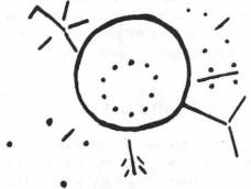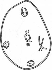 Фиг. VII. Звезда Дигитария (туземный рисунок в натуральную величину[503]). По версии же, которую излагают женщинам, отделений четыре, и они содержат зерна, металл, растения и воду. Каждое отделение в свою очередь состоит еще из двадцати отделений; все они вместе содержат 80 основных элементов. Эта звезда — резервуар и источник всего: «Она — амбар для всех вещей мира».[504] Содержимое звезды-хранилища выбрасывается центробежной силой, в форме бесконечно малых частиц, сравнимых с семенами Digitaria exilis, и быстро развивающихся: «Вещь, которая идет, [которая] выходит из [звезды] каждый день увеличивается на саму себя».[505] Другими словами, то, что выходит из этой звезды, каждый день возрастает в объеме в два раза. Из-за этой роли звезда, считающаяся самой маленькой, является и самым тяжелым небесным телом: «Дигитария — самая маленькая из всех вещей. Она — самая тяжелая звезда».[506] Она состоит из металла сагала,[507] который немного более блестящ, чем железо, и столь тяжел, «что все земные существа, объединившись, не могут ее поднять». В действительности вес звезды равен весу 480 ослиных нош[508] (около 38 000 кг), или весу всех семян, или же весу всего железа на земле», хотя в теории она имеет размер растянутой бычьей шкуры или ступки.[509]