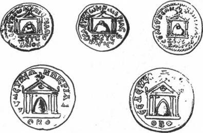 Рис. 27 На пяти римских медных монетах изображен омфал, находившийся в оракульском центре Зевса Касионского. Этот центр располагался у горы Касион, возле Латакии, и тоже входил в восточную часть оракульской октавы на широте 35° 30 . Источник: Cook A. B.Zeus. Cambridge. Vol. II, Part 2,1925, p. 982. Автор книги замечает: «Эти монеты выпущены при императорах Траяне и Антонине Пие. На них изображен храм с пирамидальной крышей, опирающейся на четыре колонны. Внутри храма находится украшенный лентами священный камень». Подобные изображения найдены также и в Дельфах, и Кук подчеркивает, что украшенный лентами камень — явно не метеорит и не фульгурит. «Гора Касион, — замечает он, — это пустынная дюна, примыкающая к Сирбонскому озеру и примечательная прежде всего святилищем Зевса Касионского». Что касается Делоса, то я хочу процитировать отрывок из книги У. X. Парка «Греческие оракулы».[250] Из него ясно видно, что этот остров вполне мог входить в гипотетическую «северную октаву» оракульских центров: «Другое преимущество Додоны перед Дельфами состояло в том, что здесь находился оракул самого Зевса. Аполлон был всего лишь сыном последнего, не без труда попавшим в греческий пантеон. Его пророчества не могли, вообще говоря, сравниться по своей значимости с речами отца богов и людей. Дельфийские жрецы нашли удачный выход из этого положения. Не отрицая верховенства Зевса, они заявили, что Аполлон — его избранный пророк! Эта концепция впервые прозвучала в гомеровском «Гимне Аполлону», причем именно в тех его частях, которые имеют отношение к Делосу. Младенец Аполлон разрывает свои пеленки и восклицает: «Ну-ка подайте мне гнутый лук и милую лиру — людям я стану вещать непреложную волю Зевеса!»[251] Делос как важный оракульский центр упоминается и в других местах поэмы. Позже он потерял это значение, но празднество на Делосе, описанное в «Гимне», явно датируется еще началом архаического периода — примерно 700 годом до н. э. Таким образом, представление об Аполлоне как о пророке Зевса возникло, по всей видимости, на Делосе, но было заимствовано и развито дельфийскими жрецами этого бога». Парк также замечает, что «на Делосе, в поздние времена известном в основном как место рождения Аполлона, некогда существовал и оракул».[252] Остров Делос был для древних греков священным местом, где запрещались любые военные действия. Выдающийся историк У. У. Тарн писал в своей статье «Политическое значение Делоса»: «Можно не сомневаться, что крохотный остров Делос занимал совершенно особое положение в религиозной жизни древних греков (поскольку на нем родился Аполлон) и в течение многих столетий почитался как «святое место». <…> Весь остров Делос считался святыней. <…> В третьем веке [до н. э.] Каллимах в своем «Гимне Делосу» именует его святейшим из островов: никто не имел права ступать на его берега с оружием в руках, и он не нуждался в оборонительных стенах, поскольку сам Аполлон защищал Делос. Эта традиция существовала с шестого по второй век [до н. э.], но возникла она значительно раньше — так сказать, одновременно с рождением Аполлона».[253] Диодор Сицилийский (I век до н. э.), основываясь на информации своих предшественников, писал, что в древние времена оракул Аполлона на Делосе играл столь же важную роль, как позже — Дельфийский оракул. «… Случилось на Родосе великое бедствие — расплодились о