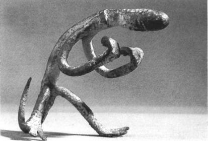 Фото 10. Единственная известная железная догонская статуэтка, изображающая Номмо. Возраст статуэтки — 300–400 лет. Хвост культурного героя напоминает здесь скорее змеиный, чем рыбий; ноги и руки лишены суставов, а ладони и ступни хорошо приспособлены для плавания. Источник: коллекция Лестера Вундермана, Нью-Йорк. ФотоЛестера Вундермана.