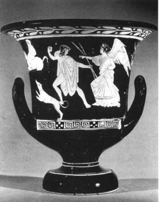 Рис. 18. Богиня Артемида спускает на Актеона свору адских псов и убивает его выстрелом из лука. В руках богини — лук, символ звезды Лука — Сириуса. Псы также символизируют Сириус — Собачью звезду. По сути дела, и сама Артемида здесь — «богиня Сириус»; однако в греческих мифах древняя традиция уже искажена и представлена лишь разрозненными элементами. Так, Артемиду греки связывали не с Сириусом, а с Луной. Тем не менее лук и псы — явные следы более древнего уровня мифологической символики. (С краснофигурной вазы, хранящейся в Берлинском музее и датируемой 470 г. до н. э.) Но что собой представляет Золотое руно? Оно, безусловно, имеет отношение к желтой краске, получаемой из шафрана (crocus sativus), травянистого растения из рода крокусов. Этот крокус и сегодня часто путают с луговым шафраном, или колхикумом, явно получившим свое имя от Колхиды, где он в основном и произрастал. Луговой шафран (на стадии цветения очень похожий на крокус) имел для древних совершенно особое значение. Он был (да и остается) единственным действенным средством от подагры. Известно, что его использовали с этой целью и в Древнем: Египте, и в других средиземноморских странах. Это обстоятельство, кстати говоря, может объяснить, почему египтяне решили основать колхидскую колонию. Вероятно, в древности Колхида изобиловала и настоящим шафраном, и колхикумом. И их так же часто путали между собой, как продолжают путать сегодня. Лишь относительно недавно ученые-ботаники установили, что эти растения различны. А поскольку из настоящего шафрана делают очень ценный краситель, то нет ничего удивительного в том, что золотое (то есть окрашенное в желтый цвет) руно должно было находиться в Колхиде. Волшебница Медея, с ее чарами и зельями, здесь тоже на своем месте. Как известно, подагра вызывает сильные боли; единственным же средством от нее было волшебное растение из далекой и загадочной страны. И. Беркилл сообщает интересные сведения о ранней истории шафрана.[226] По его словам, солнцепоклонники, говорящие на одном из индоевропейских языков, переселились с территории Турции на территорию Индии, принеся с собой в качестве одного из культовых объектов шафранный крокус, используемый и в качестве красителя.[227] Это обстоятельство также лежит в русле наших построений.[228] Ричард Аллен, говоря о созвездии Овна, отмечает, что в Египте эта группа звезд называлась «созвездием Руна».[229] Бог Зевс-Амен (Юпитер-Амон) «во время бегства богов с Олимпа, от нашествия гигантов, предводительствуемых Тифоном, принял облик Овна». Аллен также указывает, что некоторые из эпитетов, прилагавшихся к этому созвездию, позже достались Капелле (альфе Возничего). С подобным явлением мы встретимся еще не один раз. Когда внутренний смысл названий и характеристик тех или иных звезд забывается, они переносятся на соседние или на чем-то похожие звезды. Это особенно заметно на примере понятий «тяжесть» и «вес», которые постоянно присутствуют в описаниях звезд, имеющих то или иное отношение к Сириусу. «Исходное» небесное тело, с которым соотносились эти понятия, — Сириус В — для невооруженного глаза невидимо, и поэтому они постепенно оказались связаны с другими — видимыми — звездами. Равным образом, число 50 сохранилось в фольклорной традиции и после того, как его значение было утеряно; оно просто было включено в иные мифол