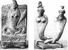 Фото 31. Эти статуэтки, посвященные богине Исиде, были найдены при раскопках в Древней Фригии. На обеих у Исиды наличествует змеиный хвост, причем вторая статуэтка изображает Исиду и Сераписа (одно из имен Осириса) с переплетенными хвостами. Сходство между этой статуэткой и китайским рельефом, воспроизведенном на рис. 50, свидетельствует об общем происхождении данного мотива (см.: Monuments Relatif аи Culte d'lsis a Cyzique. — Revue Archeologique, Paris, Vol. 5, May 1879, Plate IX). В то время они находились в частной коллекции М. А. Мортмана (Париж). Рога на голове Исиды символизируют фазы луны. Первоначально это был один из признаков богини Хатхор. На голове же Сераписа можно видеть калатос — священную корзину, с которой обычно изображались земноводный культурный герой Оаннес и бог Дагон.
