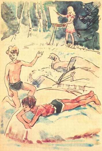 Ух, и хороша же была водичка в то утро. Ну, может, и не такая, про которуюговорят «как парное молоко», но градусов семнадцать в ней наверняка было. Мы с Генкой накупались до посинения. Я, как ящерица, распластался животом на большом теплом валуне и выбивал зубами азбуку Морзе, а Генка прыгал рядом на одной ноге, вытряхивая воду из уха. — Гляди, Серега, — сказал он, — опять эта художница пришла. Натюрморты рисовать. — Натюрморт, мой друг, — назидательно сказал я, — в переводе с испанского означает «мертвая природа». Вот, скажем, окорок свиной или баранки на веревочке — это натюрморт. А здесь кругом дикие, нетронутые джунгли с голым и вполне живым дикарем на переднем плане. Так что это называется пейзаж. Я оторвал голову от камня и посмотрел вверх, на пригорок. Девчонка установила мольберт, равнодушно взглянула в нашу сторону, а потом уселась на траву и стала смотреть куда-то на другой берег озера. Вот и вчера она точно так же с независимым видом появилась на нашем озере и, не обращая на нас никакого внимания, что-то долго колдовала над своим холстом. — Откуда она, не знаешь? — спросил я. — Колька Шпынь говорил, она к Рыжовым приехала. Внучка ихняя. — К Рыжовым? — переспросил я. — Это у которых белый налив в саду? — К ним, — сказал Генка и неожиданно добавил: — Волосы у нее хорошие. — Ты так считаешь? — Ну, я в том смысле, — смутился Генка, — что длинные. Вот если, к примеру, она тонуть начнет, то ее спасать удобно будет, легко. Утопающих, их всегда за волосы вытаскивают. — Это верно, — согласился я. Между тем девчонка поднялась с земли и начала что-то мазюкать там у себя на холсте. — А что, Генка, — сказал я, — может, пойдем представимся, раз она такая невежливая и сама нам не представляется. Правда, мы не при фраках, но надеть штаны можно. — Да нет, неудобно как-то. Вот если бы она тонуть начала, а я б ее… — А ты б ее за волосы. Понимаю. Молчи уж, осводовец. С твоим изящным собачьим стилем много не наспасаешь. Вот я бы еще мог спасти. Но она купаться-то вовсе не собирается. Она, наверное, и плавать не умеет. — А что, если… — начал Генка и, как-то робко взглянув на меня, замолчал. — Ну, ну, выкладывай. Я сегодня добрый. Генка поднял с земли камешек и, пустив по воде «блинчики», сказал: — Что, если тонуть будешь ты. Ну, понарошку, конечно. А я брошусь в воду и спасу тебя у нее на глазах. Вот это будет эффектно! Я уже было хотел заявить, что это глупая показуха, что Генка едва плавать научился, а у меня как-никак второй разряд и что вообще это бред сивой кобылы. Но вместо этого я вдруг сказал: — Согласен. Спасай. Но только вот что, Ихтиандр: мы должны все это хорошенько отрепетировать. А то ты меня так наспасаешь, что мы вместе ко дну пойдем. Да и вообще, надо, чтобы все натурально было. Пошли сейчас обедать, а вечером — репетиция. Будем вживаться в образы. По системе Станиславского.