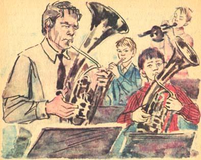 Найти кружок духового оркестра — дело не хитрое. Лишь только мы переступили порог Дома пионеров, как тут же услышали разноголосую перебранку труб, глухие барабанные удары и звон тарелок. Сразу было ясно — идет репетиция. Каждый играет что-то свое, и получается такая веселая и бестолковая неразбериха, какая бывает в классе, когда вдруг объявляют, что урок не состоится. Поднявшись на второй этаж, мы осторожно заглянули в комнату. Там за расставленными в беспорядке столами сидело много ребят с инструментами в руках. Казалось, каждый из них только и делает, что старается передудеть соседа. Перед музыкантами стоял огромного роста мужчина в защитного цвета рубашке и темно-синих брюках. — Сидоров! — вдруг рявкнул он, да так, что сразу заглушил все инструменты. — Тебе приказ играть арпеджио. А ты мне что тут за ноктюрны выводишь? И врешь на каждой ноте. Я ведь все слышу, ты меня знаешь. — Орест Иванович, ну сколько можно это арпеджио, — ответил Сидоров, ничуть не испугавшись. — Вон Брындин «Жили у бабуси» играет. — До «бабуси» ты еще не дорос, — отрезал преподаватель и наконец заметил нас с Клочиком. — Почему посторонние в зале? Закрыть дверь и не мешать! — А мы к вам, — сказал я. — Вот он в ваш кружок хочет записаться. — В наш кружок?! У нас, молодые люди, не кружок, а духовой оркестр. А кружки — это, знаете ли, ниже, на первом этаже. Там и кройки и шитья, и мягкой игрушки, и лобзиком можно по фанере… Вот туда и ступайте. А в наш оркестр набор только осенью. — Орест Иванович, вы уж, пожалуйста, сделайте исключение, — сказал хитрый Клочик. — А то мне до осени, ну, никак нельзя. Очень вас прошу. — Любишь духовую музыку? — Обожаю, — сказал Клочик. — Ну, хорошо. Я тебя послушаю. Проходи, — смягчился преподаватель. В углу комнаты стояло пианино. Орест Иванович открыл крышку, быстро проиграл какую-то мелодию и кивнул Клочику: — Давай! — Что давать? — не понял Клочик. — Ну, пой. Клочик улыбнулся. — Так я же слов не знаю, Орест Иванович. — Каких слов? — Ну, слов этой песни, которую вы сейчас сыграли. Брови преподавателя поползли на лоб. — Что за бред? Какие слова? Пой мелодию — и все. — Но как же без слов-то? Орест Иванович как-то странно дернул головой и ущипнул себя за нос. — Да так и пой без слов! — закричал он. — Ля-ля-ля! Та-ра-ра! Бу-бу-бу! Неужели не ясно, черт побери! — Понял, понял, — поспешно сказал Клочик. — Только вы, пожалуйста, еще раз эту песню сыграйте. А то я уже забыл. Преподаватель проиграл мелодию еще раз. Клочик подумал, потом промычал что-то невообразимое и как бы в оправдание сказал: — Трудно все-таки без слов. Давайте я вам лучше песню какую-нибудь спою. — Нет, нет, — сказал Орест Иванович. — Песен не надо. Он вынул из нагрудного кармана карандаш и простучал им по крышке пианино. — Простучи то же самое, — сказал он. Клочик деликатно постучал костяшкой пальца по пианино — тук-тук-тук, — словно спрашивая: можно войти? Преподаватель сморщился, будто лимон надкусил, потом ткнул в меня пальцем и сказал: — Теперь ты. — Но ведь я не… — Пой! Я не стал спорить, тем более мне самому было интересно, сумею ли? Я быстро спел вновь проигранную мелодию и отстучал карандашом. Орест Иванович помолчал несколько секунд, потом задумчиво сказал: — Ну что ж! Тебя я, пожалуй, возьму. — А меня? — спросил Клочик, почувствовав неладное, и голос у него задрожал. — У меня по пению четверка, 
