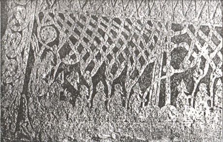 Илл. V. Резной камень периода викингов из Тьянгвиде в приходе Альског на о. Готланд в настоящее время находится в Государственном историческом музее в Стокгольме. См. с. 64, 114. Руническая надпись гласит, что он был воздвигнут в честь человека по имени Юрульф его братом. Аналогичные мифические сцены встречаются и на других камнях. См. Sune Lindquist, Gotlands Bildsteine (KVHAA, 1941–1942 гг.), I, 15–17, II, рисунки 137–138. (Photo ATA)