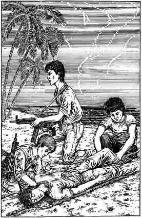 Наступало утро, но никто не просил отдыха, все были возбуждены и ждали новых действий. Вскоре после восхода солнца Мануэль, который вел с помощью бинокля круговое наблюдение, обнаружил на морском берегу какой-то странный предмет. Вызванный на пост Педро, присмотревшись, заявил, что это человек, привязанный то ли к доскам, то ли к мачте. — Надо проверить, жив ли человек, — озабоченно сказала Мария. — Если жив, наш долг — помочь ему. Мы сами натерпелись беды и знаем, что это такое. — Пожалуй, — заключил дядюшка Хосе. — Предприятие рискованное, но что значит риск, когда говорит совесть? К берегу отправились трое: Мануэль, Педро и Алеша. Алеша тащил носилки. Охранников поблизости не было. Выбравшись через окно с тыльной стороны здания, мальчики пробежали вдоль высокой стены тюремного двора и вскоре достигли берега, где росли редкие пальмы. — Вон там мы выбрались из трубы, — сказал Педро, показывая на отмель. — Как вспомню, млеет сердце. Теперь нам легче — в руках оружие. Если и суждено умереть, то умрем, глядя в свободное небо. Алеша промолчал, вспомнив об авиационной катастрофе… На песке лежал юноша лет восемнадцати — двадцати. Он был без сознания, но, судя по всему, еще жив. Видимо, не надеясь на свои силы, он привязался веревкой к деревянному трапу — это его и спасло. — Счастье, что он не захлебнулся, — сказал Педро. — Возможно, он потерял сознание совсем недавно, — предположил Мануэль. — Тело холодное, но все же я ощущаю тепло.