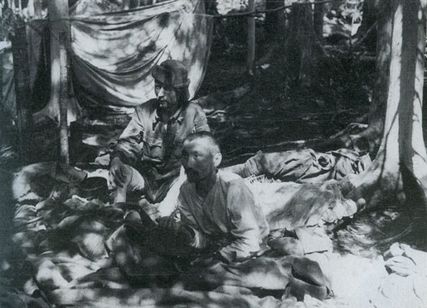 Раненые советские военнопленные. На заднем плане оголенные стволы деревьев. Корой утоляли голод. Фото Гудлаха
