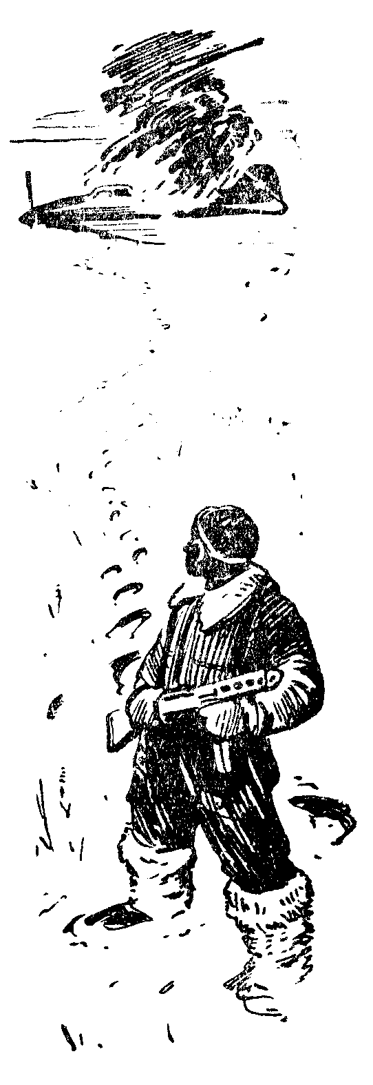 Тоскливым взглядом провожал Карлов самолеты товарищей. Последний штурмовик растаял в мутной влажной пелене, застлавшей глаза, но Георгий все всматривался в бездонную даль, пытаясь разглядеть самолеты. Перед глазами поплыли десятки сверкающих искорок. Он отвернулся. «Неужели конец?» — промелькнуло в сознании. Вылетая на боевые задания, Георгий часто задумывался: «А что, если мой самолет будет подбит? Что, если придется сесть там, у них?» Каждый раз он пытался отогнать эту навязчивую мысль, а она опять приходила: «Что же ты будешь делать, когда окажешься на земле лицом к лицу с фашистами?» И Георгий давно решил: «Только драться. Драться до последнего патрона, до последнего дыхания. Лучше смерть, чем...» Нет, он не называл это пленом. Оказаться в лапах врага представлялось ему бесчестием. Теперь, приземлившись далеко за линией фронта, он быстро осмотрелся. На многие километры, от горизонта до горизонта, лежал снег. Ни одного строения, ни одного дымка. «Главное — спокойствие, — вспомнил Георгий собственные слова, которые говорил курсантам, выпуская их в первый самостоятельный полет. — Нужно пробираться к своим. Перейти линию фронта». С трудом переставляя ноги, он прошел по глубокому снегу и отыскал автомат, сброшенный Светлишневым. Круглый диск был полон патронов. «С этим еще можно повоевать», — обрадовался летчик. Он вернулся к самолету, достал из кабины две маленькие банки сгущенного молока — остаток бортового пайка — и засунул их в широкие карманы комбинезона. С сожалением вспомнил о незаконно съеденных плитках шоколада. Несколько минут Георгий внимательно смотрел на карту, прикинул расстояние до линии фронта. Потом положил планшет на сиденье, вытащил из кобуры пистолет и выстрелил в пол кабины. Из нижнего бака фонтанчиком брызнула струйка бензина. Растекаясь, бензин окрашивал снег, и вскоре возле самолета образовалось большое розовое пятно. Георгий закурил самокрутку. С жадностью наглотавшись дыму, бросил окурок на порозовевший снег и быстро отбежал в сторону. От штурмовика метнулся красный пучок пламени. Только раз обернулся Карлов на огонь и зашагал на северо-восток.