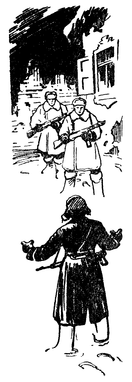 Полицай, хватая Георгия за ноги, продолжал всхлипывать: — Не убивайте, детки у меня, не убивайте... Георгий отвел в сторону автомат, уже поднятый танкистом для выстрела. — Нас здесь двое, советских людей двое. Мы имеем право судить изменников. Мы решили расстрелять тебя за предательство, за убийство человека. — Георгий не почувствовал, как полицай вытащил нож из-за голенища его валенка. — Именем Союза Советских... В этот момент полицай, словно выпрямившаяся пружина, вскочил на ноги, и в лунном свете блеснуло над Карловым стальное лезвие. Но танкист уже нажал курок автомата — в то же мгновение барабанной дробью рассыпалась короткая очередь. Выронив нож, полицай замертво повалился в снег к ногам летчика. Лошадь шарахнулась в сторону. Георгий поднял с дороги шинель и ремень, обыскал карманы убитого и взял его документы. Затем вместе с танкистом они оттащили труп от дороги и забросали снегом.