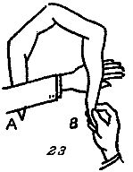 Возьмите конец В правой рукой и попросите зрителя внимательно следить за тем, как вы завязываете узел. Пропустите теперь левую руку под конец В ладонью вниз (рис. 23),