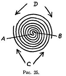 Независимо от того, какую из них, А или В, изберет зритель, показывающий может дать ему выиграть или проиграть, собирая тем или иным способом концы шнура. На рис. 25 эти два способа указаны соответственно стрелками С и D. Этот фокус удобно показывать также при помощи пояса, который сначала складывается вдвое, а затем скручивается в спираль вокруг большого и указательного пальцев (один из которых предварительно вставляется в петлю). Зритель обыкновенно старается уследить за петлей, в которую вначале был поставлен палец показывающего. Однако в какое бы место зритель ни поставил затем свой палец, считая, что он ставит его в петлю, показывающий может стянуть пояс беспрепятственно. Здесь, как и в случае со шнуром, показывающий по желанию может либо свободно стянуть пояс с пальца, либо оставить палец захваченным. Для показа другого занимательного фокуса нужен шнур и бечевка длиной не менее 6 м. Концы этого шнура связывают узлом, чтобы получилась замкнутая кривая, и кого-нибудь из присутствующих просят уложить шнур на ковре так, чтобы образовался сколь угодно сложный узор (рис. 26), но с условием, чтобы в нем не было самопересечений.