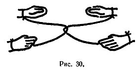 Можно, например, проделать со шнуром такие манипуляции, что на нем появится узел; он может быть обыкновенным или типа восьмерки. Можно надеть на шнур резиновое кольцо, а затем снять его со шнура, не развязывая н не разрывая при этом шнура. Если два человека соединены зацепленными шнурами, как это показано на рис. 30, то можно манипулировать со шнурами так, чтобы освободить их от связки.