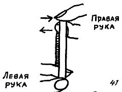 Затем оно дважды перекручивается; делается это при помощи большого и указательного пальцев, которые нужно двигать в направлениях, показанных на рис. 42 стрелками.