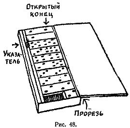 Карточки с отверстиями В несколько более сложном варианте только что рассмотренного фокуса для получения ключевых чисел применяется специальное перфорирование карточки. После того как зритель отберет все карточки, на которых имеется задуманное число, показывающий кладет их друг на друга и накрывает «волшебной» карточкой (рис. 44).