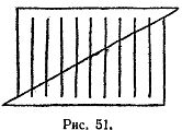 Посмотрим на отрезки этих линий над диагональю и под ней; нетрудно заметить, что длина первых уменьшается, а вторых соответственно увеличивается. Разрежем прямоугольник по пунктирной линии и сдвинем нижнюю часть влево вниз, как это показано на рис. 51.