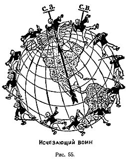 При вращении круга в обратном направлении до положения, когда большая стрела встанет опять на СВ., исчезнувший воин появится снова. Если рис. 54 рассмотреть повнимательнее, то можно заметить, что два воина в левой нижней части рисунка расположены по-особенному: они находятся друг против друга, тогда как все остальные размещены цепочкой. Эти две фигуры соответствуют крайним линиям в парадоксе с отрезками. Исходя из требований рисунка, у каждой из этих фигур должна отсутствовать часть ноги, и чтобы в повернутом положении колеса этот недостаток был менее заметен, лучше было изобразить их рядом. Вращая колесо далее, можно получить четырнадцать, пятнадцать и т. д. воинов, однако с увеличением их числа становится все более явственным, что каждая из фигур сильно тощает, давая материал для других фигур. Отметим еще, что воины изображены на рисунке с гораздо большей изобретательностью, чем это может показаться с первого взгляда. Так, например, чтобы фигуры оставались в вертикальном положении во всех местах глобуса, нужно в одном случае иметь вместо левой ноги правую, а в другом, наоборот, вместо правой ноги левую.