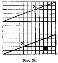 Площадь отверстия в квадратных единицах равна разности между произведением А на С и ближайшим к нему кратным размера В. Так, в последнем примере произведение А и С равно 25. Ближайшее кратное размера В к 25 есть 24, поэтому отверстие получается в одну квадратную единицу. Это правило действует независимо от того, проведена ли настоящая диагональ или же точка X на рис. 67 нанесена аккуратно на пересечении линий квадратной сетки. Если диагональ, как это и должно быть, вычерчивается как строго прямая линия или если точка X берется точно в одной из вершин квадратной сетки, то никакого парадокса не получается. В этих случаях формула дает отверстие размером в нуль квадратных единиц, обозначая этим, конечно, что отверстия нет вообще.