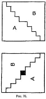 Шахматная доска разрезается наискось, как это изображено на левой половине рисунка, а затем часть В сдвигается влево вниз, как это показано на правой половине рисунка. Если треугольник, выступающий в правом верхнем углу, отрезать ножницами и поместить на свободное место, имеющее вид треугольника в левом нижнем углу рисунка, то получится прямоугольник в 7x9 квадратных единиц. Первоначальная площадь равнялась 64 квадратным единицам, теперь же она равна 63. Куда исчезла одна недостающая квадратная единица? Ответ состоит в том, что наша диагональная линия проходит несколько ниже левого нижнего угла клетки, находящейся в правом верхнем углу доски. Благодаря этому отрезанный треугольник имеет высоту, равную не 1, а 1 1/7. И, таким образом, высота равна не 9, а 9 1/7 единицам. Увеличение высоты на 1/7 единицы почти незаметно, но, будучи принято в расчет, оно приводит к требуемой площади прямоугольника в 64 квадратные единицы. Парадокс становится еще более поразительным, если вместо шахматной доски взять просто квадратный лист бумаги без клеток, так как в нашем случае при внимательном изучении обнаруживается неаккуратное смыкание клеток вдоль линии разреза. Связь нашего парадокса с парадоксом вертикальных линий, рассмотренным в предыдущей главе, становится ясной, если проследить за клетками у линии разреза. При продвижении вдоль линии разреза вверх обнаруживается, что над линией части разрезанных клеток (на рисунке они затемнены) постепенно уменьшаются, а под линией постепенно увеличиваются. На шахматной доске было пятнадцать затемненных клеток, а на прямоугольнике, получившемся после перестановки частей, их стало только четырнадцать. Кажущееся исчезновение одной затемненной клетки есть просто другая форма рассмотренного выше парадокса. Когда мы отрезаем и затем перемешаем маленький треугольничек, мы фактически разрезаем часть А шахматной доски на два куска, которые затем меняются местами вдоль диагонали. Для головоломки важны только клетки, прилежащие к линии разреза, остальные же никакого значения не имеют, играя роль оформления. Однако присутствие их меняет характер парадокса. Вместо исчезновения одной из нескольких маленьких клеток (или несколько более сложной фигуры, скажем, игральной карты, человеческого лица и т. п., которую можно было начертить внутри каждой клетки) мы сталкиваемся здесь с изменением площади большой геометрической фигуры.