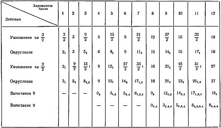 Отгадывание числа Вот один из самых замечательных фокусов этого рода. Его выделяет из подобных фокусов та особенность, что ни разу за все время демонстрации как при выполнении операций над задуманным числом, так и после получения окончательного результата зритель ничего не сообщает показывающему. И все же оказывается, что, пользуясь искусно созданными лазейками, можно постепенно подобраться к задуманному зрителем числу. Демонстрацию фокуса можно разделить на следующие шаги: 1) Вы просите кого-нибудь задумать число от 1 до 10 включительно. 2) Велите умножить его на 3. 3) Предлагаете разделить полученное число на 2. 4) Теперь вам необходимо узнать, получилась ли у зрителя в частном смешанная дробь или целое число. Чтобы добыть нужные сведения, попросите его еще раз умножить результат на 3. Если это будет сделано быстро, без видимого напряжения, есть все основания быть уверенным, что зрителю не пришлось иметь дело с дробями. Если же у него получилась дробь, он запнется и, возможно, будет несколько удивлен. Он может даже спросить, как ему быть с дробной частью. В любом случае, если вам покажется, что у зрителя в частном получилась дробь, скажите примерно следующее: «Между прочим, ваш последний результат содержит дробную часть, неправда ли? Мне так почему-то показалось. Пожалуйста, округлите ваше число в большую сторону. Ну, например, если у вас получилось 10·1/2, возьмите вместо этого числа 11». Теперь, если частное было дробным, запомните «ключевое число» 1. Если частное было целым, запоминать ничего не надо. 5) После того как в соответствии с предыдущей инструкцией было выполнено умножение на 3, велите зрителю снова разделить результат на 2. 6) Затем вам снова нужно знать, получилась ли в частном дробь или целое число. Вы говорите, например, следующее: «Теперь у вас в частном целое число, не так ли?». Если ответ будет утвердительным, произнесите: «Я так и думал» и переходите к дальнейшему. Если же вам ответят, что вы ошиблись, сделайте удивленное лицо и тут же скажите: «Ну, тогда освободитесь от дроби, взяв, как и в прошлый раз, ближайшее большее целое число». В этом последнем случае запомните следующее ключевое число 2. Если же частное было целым, запоминать ничего не надо. 7) Предложите прибавить к результату 2. 8) Попросите вычесть 11. Конечно, два последних шага означают не что иное, как вычитание 9; однако эти ваши действия имеют целью замаскировать применение принципа девятки. 9) Если зритель объявит вам, что вычитание 11 произвести невозможно, потому что последнее полученное им число слишком мало, вы сразу же сможете назвать первоначально задуманное число. Так, например, если вам пришлось запоминать только ключевое число 1, была задумана единица; если вы запоминали ключевое число 2, была задумана двойка; если же приходилось запоминать оба ключевых числа — была задумана тройка (ее можно рассматривать как результат сложения обоих ключевых чисел); если же ничего не пришлось запоминать, была задумана четверка. Допустим теперь, что вычитание числа 11 произвести можно, это будет означать, что задуманное число больше четырех. Запомните ключевое число 4 и продолжайте следующим образом: 10) Попросите добавить к последнему результату 2. 11) Велите вычесть 11. 12) Если это сделать невозможно, тогда, сложив ключевые числа, вы получаете ответ. Если же зритель молча выполнил в