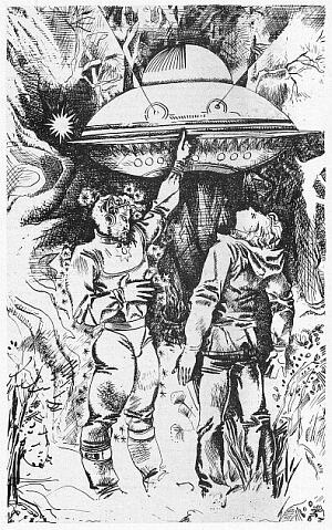 — Погоди, отец, — лениво сказал старший, Исаак. — Не шуми! Вы к кому-нибудь из нас, приятель? — Да, — ответил незнакомец. Лицо его было серьезно и благожелательно. — Я ко всем вам. — Зачем? — спросил Исаак, не трогаясь с места. — Может быть, мне предложат сесть? — человек уклонился от ответа. — Я пришел издалека! Исаак кивнул головой. Это могло быть и приглашением. Во всяком случае незнакомец счел это приглашением. Он сел рядом со стариком. Теперь все трое выжидающе смотрели на него. — Слушайте, парни, — волнуясь, начал незнакомец, — я вам дальний родственник. Моя фамилия Фицджеральд… Мое полное имя Бенжамен Фицджеральд. Можете называть меня просто Бен… Я пришел к вам познакомиться издалека. — Из Канады, — догадался Джон. — Ребята, я же вам говорил, что мой дед… — Нет, — ответил тот, — я, как бы это сказать, чтобы не напугать вас… Я из будущего. На лицах слушателей не промелькнуло и тени удивления. Они были напряжены и, казалось, одеревенели. — Из будущего, — повторил незнакомец, — из две тысячи сто семьдесят третьего года. Исаак медленно повернулся и ушел в дом. Вернулся он с двустволкой. — Обыщи его, Марк, — сказал он, — только не бей. Похоже, парень из банды Тонни-морковки. Марк проворно обыскал пришельца. Под навес полетел носовой платок, какие-то пуговицы и коробочки, величиной с записную книжку. На обеих сторонах коробочки были вмонтированы какие-то шкалы. — Что это? — спросил Исаак. — Карманная сельскохозяйственная энциклопедия и записная книжка. — Магнитофон? — Что-то вроде. — Я говорил, что он из банды, — сумрачно повторил Исаак. — Выкладывай, что тебе надо? — Убери ружье, Исаак, — сказал Бенжамен, — я действительно из будущего, и я докажу это. А пока сядем и поговорим. Принесите воды — я хочу пить! В полном молчании он напился и поставил кружку на сиденье рядом с собой. — Я прикатил на машине, — продолжал он. — На машине времени. Уже не в первый раз я добираюсь до вашего мира… — Что-то я ни разу не видел людей из будущего в этих местах, — сказал старик. — Появление среди людей другого времени запрещено и жестоко наказывается, — быстро парировал Бен. — Да и отправиться в такое путешествие может очень узкий круг лиц. Исаак, наиболее живой из всех Фицджеральдов, решил поддержать этот розыгрыш. — Ну, и за какие заслуги тебе предоставлено право на путешествия? Ты что, большая шишка? — спросил он невинно. Незнакомец не заметил иронии. — Как тебе сказать! — Бен охватил руками колено. — Я директор научно-исследовательского института биогенетики. Последнее время много работал. Мы завершили крупное исследование по генетике рудных растений. — Рудных? — Да. Ну, как тебе сказать. Слишком глубокими стали шахты и другие трудности. Вот мы и сажаем деревья, кусты и травы, которые поглощают из почвы металл. Такие растения иногда на шестьдесят процентов состоят, например, из железа или там из никеля. Каждое растение на один вид металла. Сажают их на отвалах старых рудников. Как правило. — Занятно врет! — широко ухмыляясь, сказал Марк. — Заткнись! — старый Фиц увлекся. — И на одном месте у вас, наверное, севооборот! Сначала железо, потом медь, уран или еще чего-нибудь? — Правильно, — Бен обернулся к парням. — Ваш предок смыслит кое-что в своем деле. Да все Фицджеральды, в общем, такие. Мой пра-прапрадед прославился тем, что вывел для удобства очистки кубическ