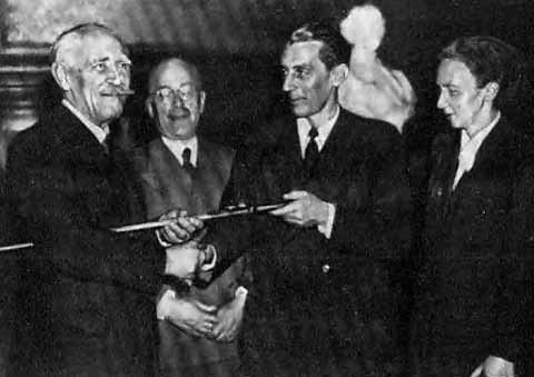 Поль Ланжевен вручает своему ученику Фредерику Жолио почетную шпагу академика. 1946.